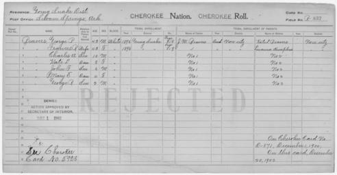 Keywords: Enrollment for Cherokee Census Card R837 - NARA - 259900.jpg Scope and content Name Charles A Beavers Type Rejected Age 10 Sex Male Degree Indian Blood White City of Residence Siloam Springs Arejected Name Frances R Beavers Type Rejected Age 43 Sex Female Degree Indian Blood White City of Residence Siloam Springs Arejected Name George P Beavers Type Rejected Age 43 Sex Male Degree Indian Blood White City of Residence Siloam Springs Arejected Name George R Beavers Type Rejected Age 2 Sex Male Degree Indian Blood White City of Residence Siloam Springs Arejected Name J M Beavers Type Parent Sex Male Name John F Beavers Type Rejected Age 6 Sex Male Degree Indian Blood White City of Residence Siloam Springs Arejected Name Kate L Beavers Type Rejected Age 8 Sex Female Degree Indian Blood White City of Residence Siloam Springs Arejected Name Kate L Beavers Type Parent Sex Female Name Mary E Beavers Type Rejected Age 4 Sex Female Degree Indian Blood White City of Residence Siloam Springs Arejected Name Louanna Humphries Type Parent Sex Female General notes 259900 Local identifier 75-53A-CHEROKEE R837 Department of the Interior Office of Indian Affairs Office of the Commissioner to the Five Civilized Tribes 1893 - 1914 NARA's Southwest Region Fort Worth NRFA 1400 John Burgess Drive Fort Worth TX 76140 Record group Record Group 75 Records of the Bureau of Indian Affairs 1793 - 1999 Record group ARC 404 Enrollment Cards compiled 1898 - 1914 Series ARC 251747 File unit File unit ARC Variant control numbers NAIL Control Number NRFF-75-53A-1370<br /> NAIL Control Number NRFF-75-53A-1373<br /> NAIL Control Number NRFF-75-53A-1374<br /> NAIL Control Number NRFF-75-53A-1375<br /> NAIL Control Number NRFF-75-53A-1376<br /> NAIL Control Number NRFF-75-53A-1378<br /> NAIL Control Number NRFF-75-53A-1380<br /> NAIL Control Number NRFF-75-53A-1381<br /> NAIL Control Number NRFF-75-53A-1382<br /> NAIL Control Number NRFF-75-53A-9447<br /> NAIL Control Number NRFF-75-53A-CHEROKEE R837 Other versions <gallery> File Enrollment_for_Cherokee_Census_Card_R837_-_NARA_-_259900 tif tif File Enrollment_for_Cherokee_Census_Card_R837_-_NARA_-_259900 jpg jpg </gallery> NARA-cooperation PD-USGov Cherokee census cards |