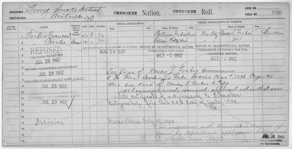 Keywords: Enrollment for Cherokee Census Card D36 - NARA - 251784.tif Local identifier 75-53A-CHEROKEE D36 Department of the Interior Office of Indian Affairs Office of the Commissioner to the Five Civilized Tribes 1893 - 1914 NARA's Southwest Region Fort Worth NRFA 1400 John Burgess Drive Fort Worth TX 76140 Record group Record Group 75 Records of the Bureau of Indian Affairs 1793 - 1999 Record group ARC 404 Enrollment Cards compiled 1898 - 1914 Series ARC 251747 Variant control numbers NAIL Control Number NRFF-75-53A-6663<br /> NAIL Control Number NRFF-75-53A-6671<br /> NAIL Control Number NRFF-75-53A-6679<br /> NAIL Control Number NRFF-75-53A-6688<br /> NAIL Control Number NRFF-75-53A-9222<br /> NAIL Control Number NRFF-75-53A-CHEROKEE D36 General notes Scope and content Name Francis E Forbes Type Doubtful Age 40 Sex Female Degree Indian Blood 1/16 City of Residence Westville Name Nancy Forbes Type Parent Sex Female Name Pearlie Forbes Type Doubtful Age 12 Sex Female Degree Indian Blood 1/32 City of Residence Westville Name William Forbes Type Parent Sex Male Name William Hotezclaw Type Parent Sex Male File unit File unit ARC yes <gallery> File Enrollment_for_Cherokee_Census_Card_D36_-_NARA_-_251784 tif tif File Enrollment_for_Cherokee_Census_Card_D36_-_NARA_-_251784 jpg jpg </gallery> NARA-cooperation PD-USGov Cherokee census cards NARA TIF images with categorized JPGs |