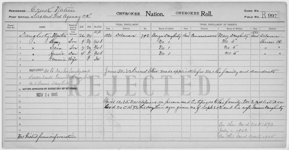 | Keywords: Enrollment for Cherokee Census Card R997 - NARA - 260060.jpg Scope and content Name Annie Daugherty Type Rejected Age 4 Sex Female Degree Indian Blood 3/4 City of Residence Sac Fox ok Name Fannie Daugherty Type Rejected Sex Female Degree Indian Blood Intermarried White City of Residence Sac Fox ok Name George Daugherty Type Parent Sex Male Name Harry Daugherty Type Rejected Age 9 Sex Male Degree Indian Blood 3/4 City of Residence Sac Fox ok Name Martin Daugherty Type Rejected Age 26 Sex Male Degree Indian Blood AS City of Residence Sac Fox ok Name Mary Daugherty Type Parent Sex Female Name Sam Daugherty Type Rejected Age 7 Sex Male Degree Indian Blood 3/4 City of Residence Sac Fox ok General notes 260060 Local identifier 75-53A-CHEROKEE R997 Department of the Interior Office of Indian Affairs Office of the Commissioner to the Five Civilized Tribes 1893 - 1914 NARA's Southwest Region Fort Worth NRFA 1400 John Burgess Drive Fort Worth TX 76140 Record group Record Group 75 Records of the Bureau of Indian Affairs 1793 - 1999 Record group ARC 404 Enrollment Cards compiled 1898 - 1914 Series ARC 251747 File unit File unit ARC Variant control numbers NAIL Control Number NRFF-75-53A-4964<br /> NAIL Control Number NRFF-75-53A-4974<br /> NAIL Control Number NRFF-75-53A-4975<br /> NAIL Control Number NRFF-75-53A-4976<br /> NAIL Control Number NRFF-75-53A-4987<br /> NAIL Control Number NRFF-75-53A-4989<br /> NAIL Control Number NRFF-75-53A-4995<br /> NAIL Control Number NRFF-75-53A-CHEROKEE R997 Other versions <gallery> File Enrollment_for_Cherokee_Census_Card_R997_-_NARA_-_260060 tif tif File Enrollment_for_Cherokee_Census_Card_R997_-_NARA_-_260060 jpg jpg </gallery> NARA-cooperation PD-USGov Cherokee census cards |