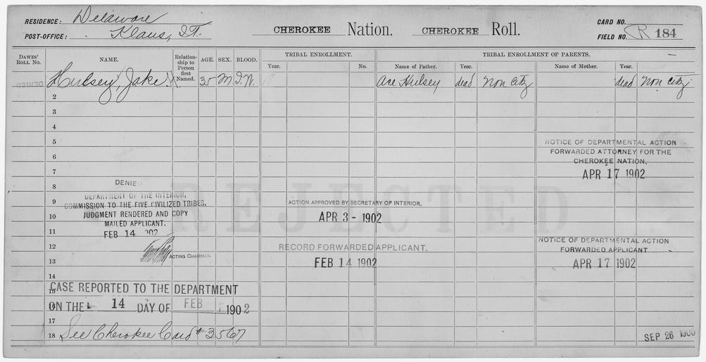 | Keywords: Enrollment for Cherokee Census Card R184 - NARA - 259247.tif Scope and content Name Ace Hulsey Type Parent Sex Male Name Jake H Hulsey Type Rejected Age 35 Sex Male Degree Indian Blood Intermarried White City of Residence Klaus General notes 259247 Local identifier 75-53A-CHEROKEE R184 Department of the Interior Office of Indian Affairs Office of the Commissioner to the Five Civilized Tribes 1893 - 1914 NARA's Southwest Region Fort Worth NRFA 1400 John Burgess Drive Fort Worth TX 76140 Record group Record Group 75 Records of the Bureau of Indian Affairs 1793 - 1999 Record group ARC 404 Enrollment Cards compiled 1898 - 1914 Series ARC 251747 File unit File unit ARC Variant control numbers NAIL Control Number NRFF-75-53A-9400<br /> NAIL Control Number NRFF-75-53A-9405<br /> NAIL Control Number NRFF-75-53A-CHEROKEE R184 yes Other versions <gallery> File Enrollment_for_Cherokee_Census_Card_R184_-_NARA_-_259247 tif tif File Enrollment_for_Cherokee_Census_Card_R184_-_NARA_-_259247 jpg jpg </gallery> NARA-cooperation PD-USGov Cherokee census cards NARA TIF images with categorized JPGs |