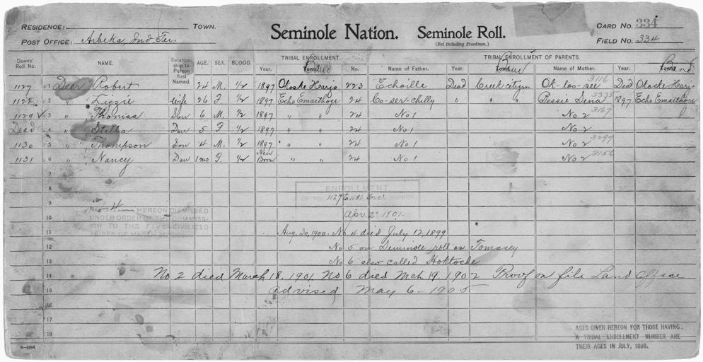 Keywords: Enrollment for Seminole Census Card 334 - NARA - 267908.jpg Scope and content Name Coserchilly Type Parent Sex Male City of Residence Creek Name Lizzie Deer Type By Blood Age 26 Sex Female Degree Indian Blood 1/2 Roll Number 1128 City of Residence ee Name Nancy Deer Type By Blood Age 1 Sex Female Degree Indian Blood 1/2 Roll Number 1131 City of Residence ee Name Robert Deer Type By Blood Age 24 Sex Male Degree Indian Blood 1/2 Roll Number 1127 City of Residence oh Name Stella Deer Type By Blood Age 5 Sex Female Degree Indian Blood 1/2 City of Residence ee Name Thomas Deer Type By Blood Age 6 Sex Male Degree Indian Blood 1/2 Roll Number 1129 City of Residence ee Name Thompson Deer Type By Blood Age 4 Sex Male Degree Indian Blood 1/2 Roll Number 1130 City of Residence ee Name Echoille Type Parent Sex Male City of Residence Creek Name Oklossee Type Parent Sex Female City of Residence oh General notes 267908 Local identifier 75-53A-SEMINOLE 334 Department of the Interior Office of Indian Affairs Office of the Commissioner to the Five Civilized Tribes 1893 - 1914 NARA's Southwest Region Fort Worth NRFA 1400 John Burgess Drive Fort Worth TX 76140 Record group Record Group 75 Records of the Bureau of Indian Affairs 1793 - 1999 Record group ARC 404 Enrollment Cards compiled 1898 - 1914 Series ARC 251747 File unit File unit ARC Variant control numbers NAIL Control Number NRFF-75-53A-28943<br /> NAIL Control Number NRFF-75-53A-30120<br /> NAIL Control Number NRFF-75-53A-30147<br /> NAIL Control Number NRFF-75-53A-30153<br /> NAIL Control Number NRFF-75-53A-30163<br /> NAIL Control Number NRFF-75-53A-30166<br /> NAIL Control Number NRFF-75-53A-30167<br /> NAIL Control Number NRFF-75-53A-30763<br /> NAIL Control Number NRFF-75-53A-43393<br /> NAIL Control Number NRFF-75-53A-SEMINOLE 334 Other versions <gallery> File Enrollment_for_Seminole_Census_Card_334_-_NARA_-_267908 tif tif File Enrollment_for_Seminole_Census_Card_334_-_NARA_-_267908 jpg jpg </gallery> NARA-cooperation PD-USGov Seminole census cards |