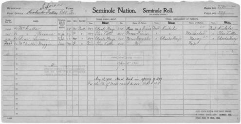 | Keywords: Enrollment for Seminole Census Card 339 - NARA - 267913.tif Scope and content Name Simon Bear Type By Blood Age 12 Sex Male Degree Indian Blood Full Roll Number 1146 City of Residence oh Name Nocas Emarther Type Parent Sex Male City of Residence oh Name Henneo Fixico Type Parent Sex Male City of Residence k Name Nocas Fixico Type Parent Sex Male City of Residence k Name McCulla Type By Blood Age 28 Sex Male Degree Indian Blood Full Roll Number 1144 City of Residence oh Name Maggie McCulla Type By Blood Age 1 Sex Female Degree Indian Blood Full City of Residence tl Name Rosanna McCulla Type By Blood Age 27 Sex Female Degree Indian Blood Full Roll Number 1145 City of Residence tl Name Monacher Type Parent Sex Female City of Residence tl General notes 267913 Local identifier 75-53A-SEMINOLE 339 Department of the Interior Office of Indian Affairs Office of the Commissioner to the Five Civilized Tribes 1893 - 1914 NARA's Southwest Region Fort Worth NRFA 1400 John Burgess Drive Fort Worth TX 76140 Record group Record Group 75 Records of the Bureau of Indian Affairs 1793 - 1999 Record group ARC 404 Enrollment Cards compiled 1898 - 1914 Series ARC 251747 File unit File unit ARC Variant control numbers NAIL Control Number NRFF-75-53A-24317<br /> NAIL Control Number NRFF-75-53A-30876<br /> NAIL Control Number NRFF-75-53A-31907<br /> NAIL Control Number NRFF-75-53A-31997<br /> NAIL Control Number NRFF-75-53A-41005<br /> NAIL Control Number NRFF-75-53A-41008<br /> NAIL Control Number NRFF-75-53A-41011<br /> NAIL Control Number NRFF-75-53A-42399<br /> NAIL Control Number NRFF-75-53A-SEMINOLE 339 yes Other versions <gallery> File Enrollment_for_Seminole_Census_Card_339_-_NARA_-_267913 tif tif File Enrollment_for_Seminole_Census_Card_339_-_NARA_-_267913 jpg jpg </gallery> NARA-cooperation PD-USGov Seminole census cards NARA TIF images with categorized JPGs |