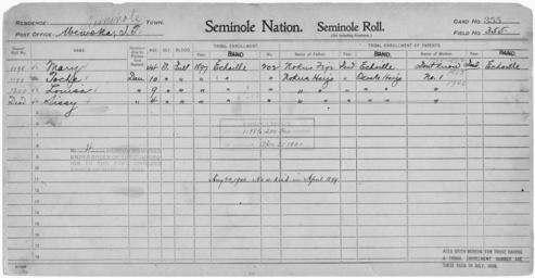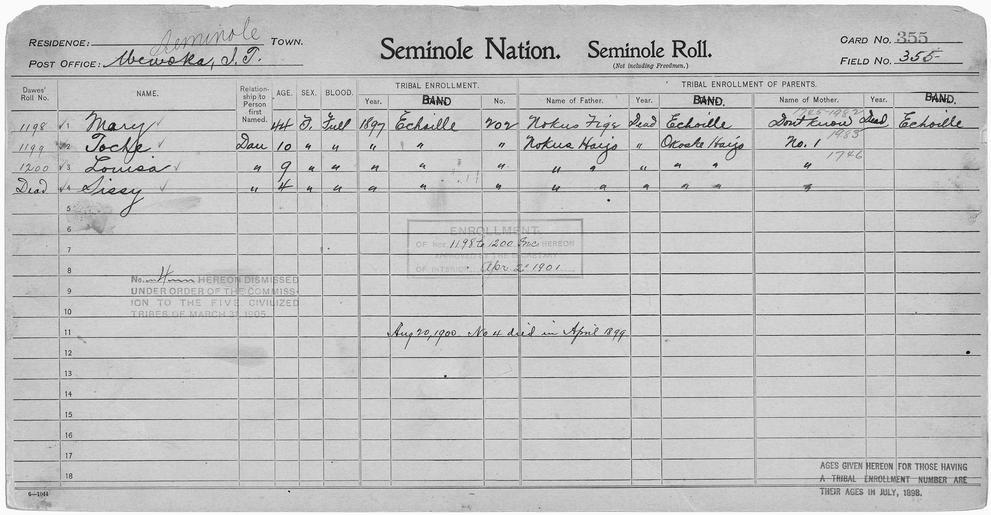 | Keywords: Enrollment for Seminole Census Card 355 - NARA - 267929.tif Scope and content Name Nokus Fife Type Parent Sex Male City of Residence e Name Nokus Harjo Type Parent Sex Male City of Residence oh Name Louisa Type By Blood Age 9 Sex Female Degree Indian Blood Full Roll Number 1200 City of Residence e Name Mary Type By Blood Age 44 Sex Female Degree Indian Blood Full Roll Number 1198 City of Residence e Name Sissy Type By Blood Age 4 Sex Female Degree Indian Blood Full City of Residence e Name Toche Type By Blood Age 10 Sex Female Degree Indian Blood Full Roll Number 1199 City of Residence e General notes 267929 Local identifier 75-53A-SEMINOLE 355 Department of the Interior Office of Indian Affairs Office of the Commissioner to the Five Civilized Tribes 1893 - 1914 NARA's Southwest Region Fort Worth NRFA 1400 John Burgess Drive Fort Worth TX 76140 Record group Record Group 75 Records of the Bureau of Indian Affairs 1793 - 1999 Record group ARC 404 Enrollment Cards compiled 1898 - 1914 Series ARC 251747 File unit File unit ARC Variant control numbers NAIL Control Number NRFF-75-53A-31526<br /> NAIL Control Number NRFF-75-53A-34870<br /> NAIL Control Number NRFF-75-53A-39935<br /> NAIL Control Number NRFF-75-53A-40806<br /> NAIL Control Number NRFF-75-53A-47116<br /> NAIL Control Number NRFF-75-53A-49970<br /> NAIL Control Number NRFF-75-53A-SEMINOLE 355 yes Other versions <gallery> File Enrollment_for_Seminole_Census_Card_355_-_NARA_-_267929 tif tif File Enrollment_for_Seminole_Census_Card_355_-_NARA_-_267929 jpg jpg </gallery> NARA-cooperation PD-USGov Seminole census cards NARA TIF images with categorized JPGs |