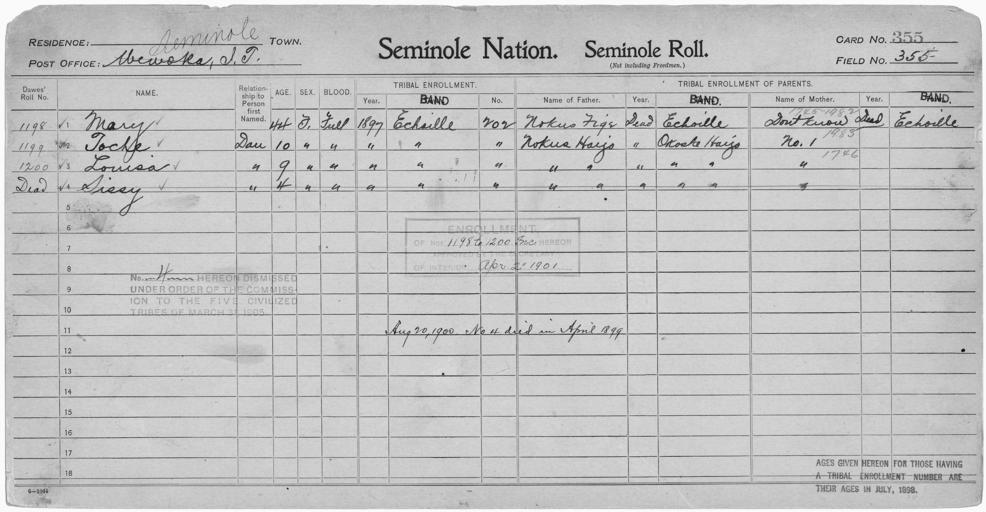 | Keywords: Enrollment for Seminole Census Card 355 - NARA - 267929.jpg Scope and content Name Nokus Fife Type Parent Sex Male City of Residence e Name Nokus Harjo Type Parent Sex Male City of Residence oh Name Louisa Type By Blood Age 9 Sex Female Degree Indian Blood Full Roll Number 1200 City of Residence e Name Mary Type By Blood Age 44 Sex Female Degree Indian Blood Full Roll Number 1198 City of Residence e Name Sissy Type By Blood Age 4 Sex Female Degree Indian Blood Full City of Residence e Name Toche Type By Blood Age 10 Sex Female Degree Indian Blood Full Roll Number 1199 City of Residence e General notes 267929 Local identifier 75-53A-SEMINOLE 355 Department of the Interior Office of Indian Affairs Office of the Commissioner to the Five Civilized Tribes 1893 - 1914 NARA's Southwest Region Fort Worth NRFA 1400 John Burgess Drive Fort Worth TX 76140 Record group Record Group 75 Records of the Bureau of Indian Affairs 1793 - 1999 Record group ARC 404 Enrollment Cards compiled 1898 - 1914 Series ARC 251747 File unit File unit ARC Variant control numbers NAIL Control Number NRFF-75-53A-31526<br /> NAIL Control Number NRFF-75-53A-34870<br /> NAIL Control Number NRFF-75-53A-39935<br /> NAIL Control Number NRFF-75-53A-40806<br /> NAIL Control Number NRFF-75-53A-47116<br /> NAIL Control Number NRFF-75-53A-49970<br /> NAIL Control Number NRFF-75-53A-SEMINOLE 355 Other versions <gallery> File Enrollment_for_Seminole_Census_Card_355_-_NARA_-_267929 tif tif File Enrollment_for_Seminole_Census_Card_355_-_NARA_-_267929 jpg jpg </gallery> NARA-cooperation PD-USGov Seminole census cards |