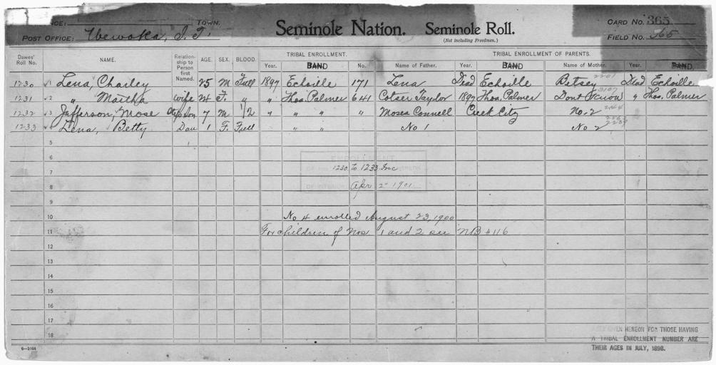 | Keywords: Enrollment for Seminole Census Card 365 - NARA - 267939.jpg Scope and content Name Moses Connell Type Parent Sex Male City of Residence Creek Name Mose Jefferson Type By Blood Age 7 Sex Male Degree Indian Blood 1/2 Roll Number 1232 City of Residence tp Name Betty Lena Type By Blood Age 1 Sex Female Degree Indian Blood Full Roll Number 1233 City of Residence tp Name Charley Lena Type By Blood Age 25 Sex Male Degree Indian Blood Full Roll Number 1230 City of Residence e Name Martha Lena Type By Blood Age 24 Sex Female Degree Indian Blood Full Roll Number 1231 City of Residence tp Name Cotser Taylor Type Parent Sex Male City of Residence tp General notes 267939 Local identifier 75-53A-SEMINOLE 365 Department of the Interior Office of Indian Affairs Office of the Commissioner to the Five Civilized Tribes 1893 - 1914 NARA's Southwest Region Fort Worth NRFA 1400 John Burgess Drive Fort Worth TX 76140 Record group Record Group 75 Records of the Bureau of Indian Affairs 1793 - 1999 Record group ARC 404 Enrollment Cards compiled 1898 - 1914 Series ARC 251747 File unit File unit ARC Variant control numbers NAIL Control Number NRFF-75-53A-28688<br /> NAIL Control Number NRFF-75-53A-37498<br /> NAIL Control Number NRFF-75-53A-39279<br /> NAIL Control Number NRFF-75-53A-39281<br /> NAIL Control Number NRFF-75-53A-39287<br /> NAIL Control Number NRFF-75-53A-48666<br /> NAIL Control Number NRFF-75-53A-SEMINOLE 365 Other versions <gallery> File Enrollment_for_Seminole_Census_Card_365_-_NARA_-_267939 tif tif File Enrollment_for_Seminole_Census_Card_365_-_NARA_-_267939 jpg jpg </gallery> NARA-cooperation PD-USGov Seminole census cards |