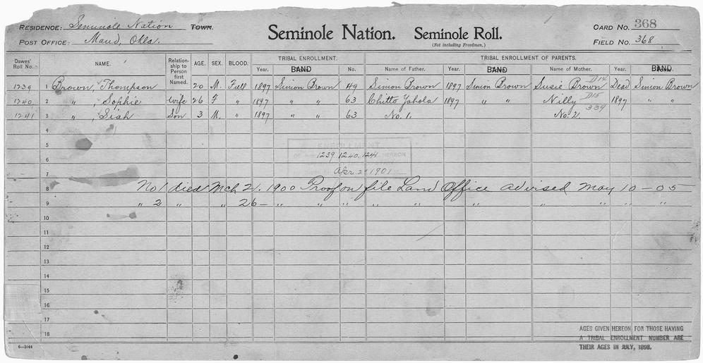 | Keywords: Enrollment for Seminole Census Card 368 - NARA - 267942.tif Scope and content Name Siah Brown Type By Blood Age 3 Sex Male Degree Indian Blood Full Roll Number 1241 City of Residence sb Name Simon Brown Type Parent Sex Male City of Residence sb Name Sophie Brown Type By Blood Age 26 Sex Female Degree Indian Blood Full Roll Number 1240 City of Residence sb Name Susie Brown Type Parent Sex Female City of Residence sb Name Thompson Brown Type By Blood Age 20 Sex Male Degree Indian Blood Full Roll Number 1239 City of Residence sb Name Nilly Type Parent Sex Female City of Residence sb Name Chitto Yahola Type Parent Sex Male City of Residence sb General notes 267942 Local identifier 75-53A-SEMINOLE 368 Department of the Interior Office of Indian Affairs Office of the Commissioner to the Five Civilized Tribes 1893 - 1914 NARA's Southwest Region Fort Worth NRFA 1400 John Burgess Drive Fort Worth TX 76140 Record group Record Group 75 Records of the Bureau of Indian Affairs 1793 - 1999 Record group ARC 404 Enrollment Cards compiled 1898 - 1914 Series ARC 251747 File unit File unit ARC Variant control numbers NAIL Control Number NRFF-75-53A-25951<br /> NAIL Control Number NRFF-75-53A-25955<br /> NAIL Control Number NRFF-75-53A-25959<br /> NAIL Control Number NRFF-75-53A-25965<br /> NAIL Control Number NRFF-75-53A-25974<br /> NAIL Control Number NRFF-75-53A-43177<br /> NAIL Control Number NRFF-75-53A-52081<br /> NAIL Control Number NRFF-75-53A-SEMINOLE 368 yes Other versions <gallery> File Enrollment_for_Seminole_Census_Card_368_-_NARA_-_267942 tif tif File Enrollment_for_Seminole_Census_Card_368_-_NARA_-_267942 jpg jpg </gallery> NARA-cooperation PD-USGov Seminole census cards NARA TIF images with categorized JPGs |