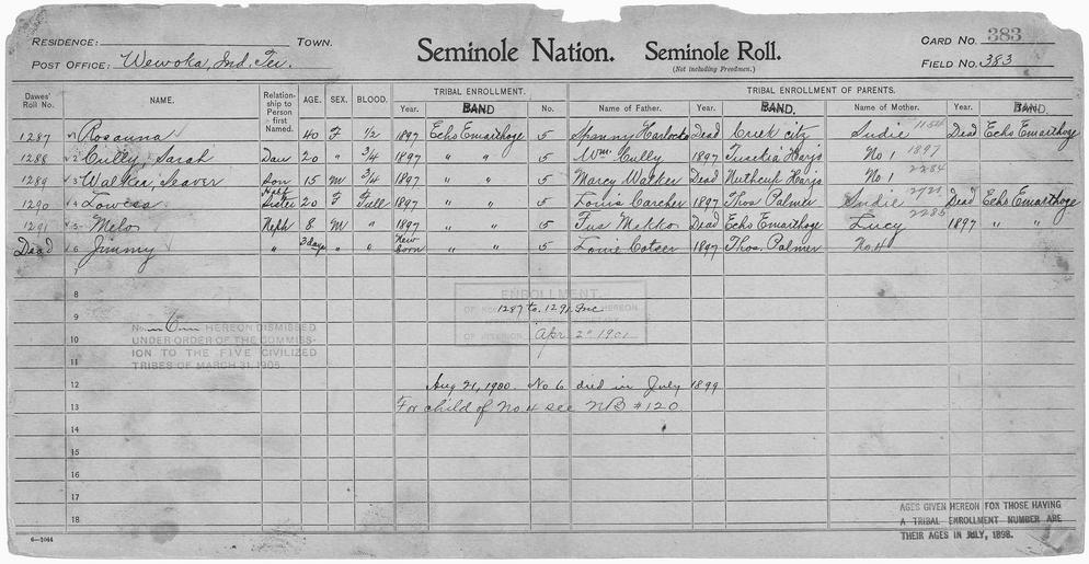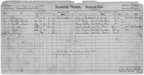 Keywords: Enrollment for Seminole Census Card 383 - NARA - 267957.tif Scope and content Name Louis Carcher Type Parent Sex Male City of Residence tp Name Louie Cotser Type Parent Sex Male City of Residence tp Name Sarah Cully Type By Blood Age 20 Sex Female Degree Indian Blood 3/4 Roll Number 1288 City of Residence ee Name William Cully Type Parent Sex Male City of Residence th Name Spanny Harlocko Type Parent Sex Male City of Residence Creek Name Jimmy Type By Blood Age 1 Sex Male Degree Indian Blood Full City of Residence ee Name Lowesa Type By Blood Age 20 Sex Female Degree Indian Blood Full Roll Number 1290 City of Residence ee Name Lucy Type Parent Sex Female City of Residence ee Name Fus Mekko Type Parent Sex Male City of Residence ee Name Melo Type By Blood Age 8 Sex Male Degree Indian Blood Full Roll Number 1291 City of Residence ee Name Rosanna Type By Blood Age 40 Sex Female Degree Indian Blood 1/2 Roll Number 1287 City of Residence ee Name Sudie Type Parent Sex Female City of Residence ee Name Marcy Walker Type Parent Sex Male City of Residence nh Name Seaver Walker Type By Blood Age 15 Sex Male Degree Indian Blood 3/4 Roll Number 1289 City of Residence ee General notes 267957 Local identifier 75-53A-SEMINOLE 383 Department of the Interior Office of Indian Affairs Office of the Commissioner to the Five Civilized Tribes 1893 - 1914 NARA's Southwest Region Fort Worth NRFA 1400 John Burgess Drive Fort Worth TX 76140 Record group Record Group 75 Records of the Bureau of Indian Affairs 1793 - 1999 Record group ARC 404 Enrollment Cards compiled 1898 - 1914 Series ARC 251747 File unit File unit ARC Variant control numbers NAIL Control Number NRFF-75-53A-27119<br /> NAIL Control Number NRFF-75-53A-28967<br /> NAIL Control Number NRFF-75-53A-29338<br /> NAIL Control Number NRFF-75-53A-29343<br /> NAIL Control Number NRFF-75-53A-35465<br /> NAIL Control Number NRFF-75-53A-37626<br /> NAIL Control Number NRFF-75-53A-40074<br /> NAIL Control Number NRFF-75-53A-40175<br /> NAIL Control Number NRFF-75-53A-41746<br /> NAIL Control Number NRFF-75-53A-41786<br /> NAIL Control Number NRFF-75-53A-45423<br /> NAIL Control Number NRFF-75-53A-48181<br /> NAIL Control Number NRFF-75-53A-50522<br /> NAIL Control Number NRFF-75-53A-50539<br /> NAIL Control Number NRFF-75-53A-SEMINOLE 383 yes Other versions <gallery> File Enrollment_for_Seminole_Census_Card_383_-_NARA_-_267957 tif tif File Enrollment_for_Seminole_Census_Card_383_-_NARA_-_267957 jpg jpg </gallery> NARA-cooperation PD-USGov Seminole census cards NARA TIF images with categorized JPGs |