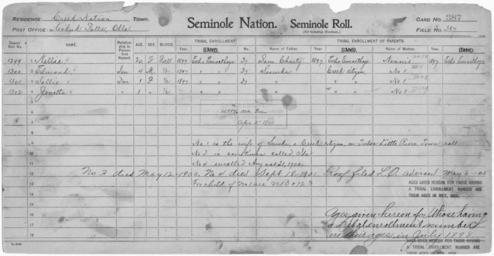 Keywords: Enrollment for Seminole Census Card 387 - NARA - 267961.jpg Scope and content Name Sam Charty Type Parent Sex Male City of Residence ee Name Edmond Type By Blood Age 4 Sex Male Degree Indian Blood 1/2 Roll Number 1300 City of Residence ee Name Jenetta Type By Blood Age 1 Sex Female Degree Indian Blood 1/2 Roll Number 1302 City of Residence ee Name Nannie Type Parent Sex Female City of Residence ee Name Nellie Type By Blood Age 20 Sex Female Degree Indian Blood Full Roll Number 1299 City of Residence ee Name Sallie Type By Blood Age 1 Sex Female Degree Indian Blood 1/2 Roll Number 1301 City of Residence ee Name Sumka Type Parent Sex Male City of Residence Creek General notes 267961 Local identifier 75-53A-SEMINOLE 387 Department of the Interior Office of Indian Affairs Office of the Commissioner to the Five Civilized Tribes 1893 - 1914 NARA's Southwest Region Fort Worth NRFA 1400 John Burgess Drive Fort Worth TX 76140 Record group Record Group 75 Records of the Bureau of Indian Affairs 1793 - 1999 Record group ARC 404 Enrollment Cards compiled 1898 - 1914 Series ARC 251747 File unit File unit ARC Variant control numbers NAIL Control Number NRFF-75-53A-27511<br /> NAIL Control Number NRFF-75-53A-30774<br /> NAIL Control Number NRFF-75-53A-37532<br /> NAIL Control Number NRFF-75-53A-42952<br /> NAIL Control Number NRFF-75-53A-43042<br /> NAIL Control Number NRFF-75-53A-45623<br /> NAIL Control Number NRFF-75-53A-48331<br /> NAIL Control Number NRFF-75-53A-SEMINOLE 387 Other versions <gallery> File Enrollment_for_Seminole_Census_Card_387_-_NARA_-_267961 tif tif File Enrollment_for_Seminole_Census_Card_387_-_NARA_-_267961 jpg jpg </gallery> NARA-cooperation PD-USGov Seminole census cards |
