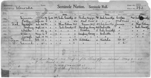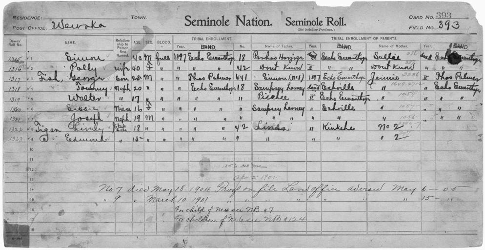 Keywords: Enrollment for Seminole Census Card 393 - NARA - 267967.jpg Scope and content Name Edward Type By Blood Age 15 Sex Male Degree Indian Blood Full Roll Number 1323 City of Residence ee Name George Fish Type By Blood Age 25 Sex Male Degree Indian Blood Full Roll Number 1317 City of Residence tp Name Parhos Harjoge Type Parent Sex Male City of Residence ee Name Joseph Type By Blood Age 19 Sex Male Degree Indian Blood Full Roll Number 1321 City of Residence ee Name Sampsey Larney Type Parent Sex Male City of Residence e Name Pischee Type Parent Sex Male City of Residence ee Name Polly Type By Blood Age 40 Sex Female Degree Indian Blood Full Roll Number 1316 City of Residence ee Name Simon Type By Blood Age 40 Sex Male Degree Indian Blood Full Roll Number 1315 City of Residence ee Name Sissie Type By Blood Age 16 Sex Female Degree Indian Blood Full Roll Number 1320 City of Residence ee Name Lively Tiger Type By Blood Age 18 Sex Male Degree Indian Blood Full Roll Number 1322 City of Residence ee Name Tommy Type By Blood Age 20 Sex Male Degree Indian Blood Full Roll Number 1318 City of Residence ee Name Wlater Type By Blood Age 17 Sex Male Degree Indian Blood Full Roll Number 1319 City of Residence ee General notes 267967 Local identifier 75-53A-SEMINOLE 393 Department of the Interior Office of Indian Affairs Office of the Commissioner to the Five Civilized Tribes 1893 - 1914 NARA's Southwest Region Fort Worth NRFA 1400 John Burgess Drive Fort Worth TX 76140 Record group Record Group 75 Records of the Bureau of Indian Affairs 1793 - 1999 Record group ARC 404 Enrollment Cards compiled 1898 - 1914 Series ARC 251747 File unit File unit ARC Variant control numbers NAIL Control Number NRFF-75-53A-30777<br /> NAIL Control Number NRFF-75-53A-31619<br /> NAIL Control Number NRFF-75-53A-35446<br /> NAIL Control Number NRFF-75-53A-38161<br /> NAIL Control Number NRFF-75-53A-39059<br /> NAIL Control Number NRFF-75-53A-44194<br /> NAIL Control Number NRFF-75-53A-44315<br /> NAIL Control Number NRFF-75-53A-46996<br /> NAIL Control Number NRFF-75-53A-47111<br /> NAIL Control Number NRFF-75-53A-49614<br /> NAIL Control Number NRFF-75-53A-50022<br /> NAIL Control Number NRFF-75-53A-51805<br /> NAIL Control Number NRFF-75-53A-SEMINOLE 393 Other versions <gallery> File Enrollment_for_Seminole_Census_Card_393_-_NARA_-_267967 tif tif File Enrollment_for_Seminole_Census_Card_393_-_NARA_-_267967 jpg jpg </gallery> NARA-cooperation PD-USGov Seminole census cards |