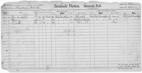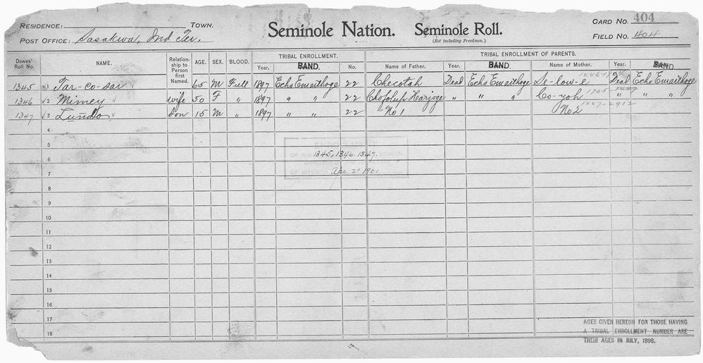 Keywords: Enrollment for Seminole Census Card 404 - NARA - 267978.tif Scope and content Name Checotah Type Parent Sex Male City of Residence ee Name Coyoh Type Parent Sex Female City of Residence ee Name Chofolup Harjoge Type Parent Sex Male City of Residence ee Name Lundoo Type By Blood Age 15 Sex Male Degree Indian Blood Full Roll Number 1347 City of Residence ee Name Mimey Type By Blood Age 50 Sex Female Degree Indian Blood Full Roll Number 1346 City of Residence ee Name Selowe Type Parent Sex Female City of Residence ee Name Tarcosar Type By Blood Age 65 Sex Male Degree Indian Blood Full Roll Number 1345 City of Residence ee General notes 267978 Local identifier 75-53A-SEMINOLE 404 Department of the Interior Office of Indian Affairs Office of the Commissioner to the Five Civilized Tribes 1893 - 1914 NARA's Southwest Region Fort Worth NRFA 1400 John Burgess Drive Fort Worth TX 76140 Record group Record Group 75 Records of the Bureau of Indian Affairs 1793 - 1999 Record group ARC 404 Enrollment Cards compiled 1898 - 1914 Series ARC 251747 File unit File unit ARC Variant control numbers NAIL Control Number NRFF-75-53A-27536<br /> NAIL Control Number NRFF-75-53A-29042<br /> NAIL Control Number NRFF-75-53A-35436<br /> NAIL Control Number NRFF-75-53A-40198<br /> NAIL Control Number NRFF-75-53A-42191<br /> NAIL Control Number NRFF-75-53A-46583<br /> NAIL Control Number NRFF-75-53A-48568<br /> NAIL Control Number NRFF-75-53A-SEMINOLE 404 yes Other versions <gallery> File Enrollment_for_Seminole_Census_Card_404_-_NARA_-_267978 tif tif File Enrollment_for_Seminole_Census_Card_404_-_NARA_-_267978 jpg jpg </gallery> NARA-cooperation PD-USGov Seminole census cards NARA TIF images with categorized JPGs |