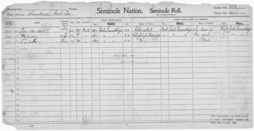 Keywords: Enrollment for Seminole Census Card 404 - NARA - 267978.jpg Scope and content Name Checotah Type Parent Sex Male City of Residence ee Name Coyoh Type Parent Sex Female City of Residence ee Name Chofolup Harjoge Type Parent Sex Male City of Residence ee Name Lundoo Type By Blood Age 15 Sex Male Degree Indian Blood Full Roll Number 1347 City of Residence ee Name Mimey Type By Blood Age 50 Sex Female Degree Indian Blood Full Roll Number 1346 City of Residence ee Name Selowe Type Parent Sex Female City of Residence ee Name Tarcosar Type By Blood Age 65 Sex Male Degree Indian Blood Full Roll Number 1345 City of Residence ee General notes 267978 Local identifier 75-53A-SEMINOLE 404 Department of the Interior Office of Indian Affairs Office of the Commissioner to the Five Civilized Tribes 1893 - 1914 NARA's Southwest Region Fort Worth NRFA 1400 John Burgess Drive Fort Worth TX 76140 Record group Record Group 75 Records of the Bureau of Indian Affairs 1793 - 1999 Record group ARC 404 Enrollment Cards compiled 1898 - 1914 Series ARC 251747 File unit File unit ARC Variant control numbers NAIL Control Number NRFF-75-53A-27536<br /> NAIL Control Number NRFF-75-53A-29042<br /> NAIL Control Number NRFF-75-53A-35436<br /> NAIL Control Number NRFF-75-53A-40198<br /> NAIL Control Number NRFF-75-53A-42191<br /> NAIL Control Number NRFF-75-53A-46583<br /> NAIL Control Number NRFF-75-53A-48568<br /> NAIL Control Number NRFF-75-53A-SEMINOLE 404 Other versions <gallery> File Enrollment_for_Seminole_Census_Card_404_-_NARA_-_267978 tif tif File Enrollment_for_Seminole_Census_Card_404_-_NARA_-_267978 jpg jpg </gallery> NARA-cooperation PD-USGov Seminole census cards |