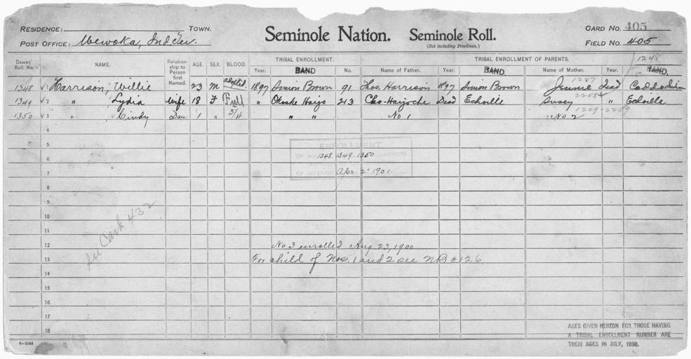 Keywords: Enrollment for Seminole Census Card 405 - NARA - 267979.jpg Scope and content Name Choharjoche Type Parent Sex Male City of Residence e Name Cindy Harrison Type By Blood Age 1 Sex Female Degree Indian Blood 3/4 Roll Number 1350 City of Residence oh Name Lydia Harrison Type By Blood Age 18 Sex Female Degree Indian Blood Full Roll Number 1349 City of Residence oh Name Thomas Harrison Type Parent Sex Male City of Residence sb Name Willie Harrison Type By Blood Age 23 Sex Male Roll Number 1348 City of Residence sb Name Jennie Type Parent Sex Female City of Residence Caddo Name Susey Type Parent Sex Female City of Residence e General notes 267979 Local identifier 75-53A-SEMINOLE 405 Department of the Interior Office of Indian Affairs Office of the Commissioner to the Five Civilized Tribes 1893 - 1914 NARA's Southwest Region Fort Worth NRFA 1400 John Burgess Drive Fort Worth TX 76140 Record group Record Group 75 Records of the Bureau of Indian Affairs 1793 - 1999 Record group ARC 404 Enrollment Cards compiled 1898 - 1914 Series ARC 251747 File unit File unit ARC Variant control numbers NAIL Control Number NRFF-75-53A-27978<br /> NAIL Control Number NRFF-75-53A-35584<br /> NAIL Control Number NRFF-75-53A-35614<br /> NAIL Control Number NRFF-75-53A-35641<br /> NAIL Control Number NRFF-75-53A-35651<br /> NAIL Control Number NRFF-75-53A-37554<br /> NAIL Control Number NRFF-75-53A-48414<br /> NAIL Control Number NRFF-75-53A-SEMINOLE 405 Other versions <gallery> File Enrollment_for_Seminole_Census_Card_405_-_NARA_-_267979 tif tif File Enrollment_for_Seminole_Census_Card_405_-_NARA_-_267979 jpg jpg </gallery> NARA-cooperation PD-USGov Seminole census cards |