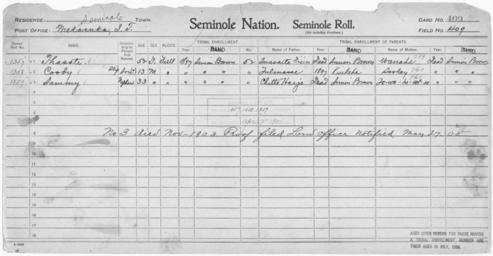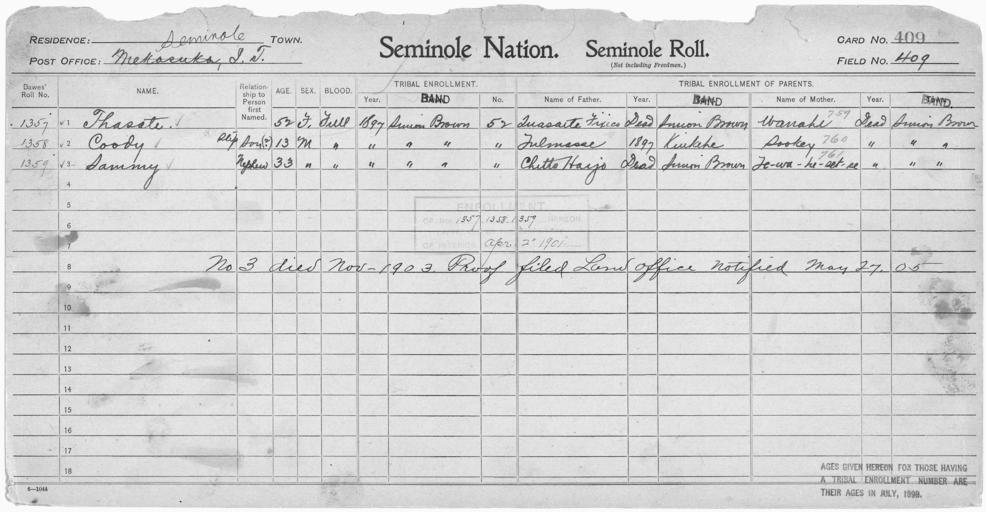 Keywords: Enrollment for Seminole Census Card 409 - NARA - 267983.jpg Scope and content Name Coody Type By Blood Age 13 Sex Male Degree Indian Blood Full Roll Number 1358 City of Residence sb Name Quasarte Fixico Type Parent Sex Male City of Residence sb Name Chitto Harjo Type Parent Sex Male City of Residence sb Name Sammy Type By Blood Age 33 Sex Male Degree Indian Blood Full Roll Number 1359 City of Residence sb Name Sookey Type Parent Sex Female City of Residence sb Name Tewahesetse Type Parent Sex Female City of Residence sb Name Thasate Type By Blood Age 52 Sex Female Degree Indian Blood Full Roll Number 1357 City of Residence sb Name Tulmasse Type Parent Sex Male City of Residence k Name Wanahe Type Parent Sex Female City of Residence sb General notes 267983 Local identifier 75-53A-SEMINOLE 409 Department of the Interior Office of Indian Affairs Office of the Commissioner to the Five Civilized Tribes 1893 - 1914 NARA's Southwest Region Fort Worth NRFA 1400 John Burgess Drive Fort Worth TX 76140 Record group Record Group 75 Records of the Bureau of Indian Affairs 1793 - 1999 Record group ARC 404 Enrollment Cards compiled 1898 - 1914 Series ARC 251747 File unit File unit ARC Variant control numbers NAIL Control Number NRFF-75-53A-28734<br /> NAIL Control Number NRFF-75-53A-32058<br /> NAIL Control Number NRFF-75-53A-34192<br /> NAIL Control Number NRFF-75-53A-45660<br /> NAIL Control Number NRFF-75-53A-47640<br /> NAIL Control Number NRFF-75-53A-48907<br /> NAIL Control Number NRFF-75-53A-48936<br /> NAIL Control Number NRFF-75-53A-50122<br /> NAIL Control Number NRFF-75-53A-50583<br /> NAIL Control Number NRFF-75-53A-SEMINOLE 409 Other versions <gallery> File Enrollment_for_Seminole_Census_Card_409_-_NARA_-_267983 tif tif File Enrollment_for_Seminole_Census_Card_409_-_NARA_-_267983 jpg jpg </gallery> NARA-cooperation PD-USGov Seminole census cards |