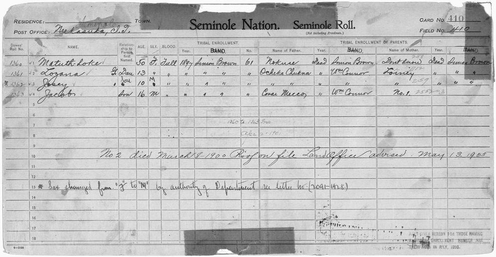Keywords: Enrollment for Seminole Census Card 410 - NARA - 267984.tif Scope and content Name Ocheka Chukna Type Parent Sex Male City of Residence wc Name Jacob Type By Blood Age 16 Sex Male Degree Indian Blood Full Roll Number 1363 City of Residence sb Name Josey Type By Blood Age 10 Sex Male Degree Indian Blood Full Roll Number 1362 City of Residence sb Name Loiney Type Parent Sex Female City of Residence sb Name Lozana Type By Blood Age 13 Sex Female Degree Indian Blood Full Roll Number 1361 City of Residence sb Name Matuthloke Type By Blood Age 50 Sex Female Degree Indian Blood Full Roll Number 1360 City of Residence sb Name Cosar Mecco Type Parent Sex Male City of Residence wc Name Nokuse Type Parent Sex Male City of Residence sb General notes 267984 Local identifier 75-53A-SEMINOLE 410 Department of the Interior Office of Indian Affairs Office of the Commissioner to the Five Civilized Tribes 1893 - 1914 NARA's Southwest Region Fort Worth NRFA 1400 John Burgess Drive Fort Worth TX 76140 Record group Record Group 75 Records of the Bureau of Indian Affairs 1793 - 1999 Record group ARC 404 Enrollment Cards compiled 1898 - 1914 Series ARC 251747 File unit File unit ARC Variant control numbers NAIL Control Number NRFF-75-53A-28034<br /> NAIL Control Number NRFF-75-53A-37365<br /> NAIL Control Number NRFF-75-53A-38182<br /> NAIL Control Number NRFF-75-53A-39684<br /> NAIL Control Number NRFF-75-53A-40086<br /> NAIL Control Number NRFF-75-53A-40844<br /> NAIL Control Number NRFF-75-53A-41720<br /> NAIL Control Number NRFF-75-53A-43258<br /> NAIL Control Number NRFF-75-53A-SEMINOLE 410 yes Other versions <gallery> File Enrollment_for_Seminole_Census_Card_410_-_NARA_-_267984 tif tif File Enrollment_for_Seminole_Census_Card_410_-_NARA_-_267984 jpg jpg </gallery> NARA-cooperation PD-USGov Seminole census cards NARA TIF images with categorized JPGs |