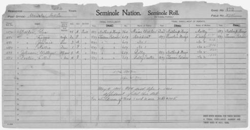 | Keywords: Enrollment for Seminole Census Card 472 - NARA - 268046.jpg  Scope and content Name Billy Type Parent Sex Male City of Residence nh Name Billy Foster Type Parent Sex Male City of Residence tp Name Lillie Foster Type By Blood Age 4 Sex Female Degree Indian Blood Full Roll Number 1584 City of Residence tp Name Willeya Johnson Type By Blood Age 8 Sex Male Degree Indian Blood Full Roll Number 1583 City of Residence tp Name Lucy Type Parent Sex Female City of Residence tp Name Molly Type Parent Sex Female City of Residence nh Name Ben Walker Type By Blood Age 28 Sex Male Degree Indian Blood Full Roll Number 1579 City of Residence nh Name Jimmie Walker Type By Blood Age 3 Sex Male Degree Indian Blood Full Roll Number 1581 City of Residence tp Name Lizzie Walker Type By Blood Age 30 Sex Female Degree Indian Blood Full Roll Number 1580 City of Residence tp Name Maise Walker Type Parent Sex Male City of Residence nh Name Mollie Walker Type By Blood Age 1 Sex Female Degree Indian Blood Full Roll Number 1582 City of Residence tp Name Wildcat Type Parent Sex Male City of Residence th General notes 268046 Local identifier 75-53A-SEMINOLE 472 Department of the Interior Office of Indian Affairs Office of the Commissioner to the Five Civilized Tribes 1893 - 1914 NARA's Southwest Region Fort Worth NRFA 1400 John Burgess Drive Fort Worth TX 76140 Record group Record Group 75 Records of the Bureau of Indian Affairs 1793 - 1999 Record group ARC 404 Enrollment Cards compiled 1898 - 1914 Series ARC 251747 File unit File unit ARC Variant control numbers NAIL Control Number NRFF-75-53A-25102<br /> NAIL Control Number NRFF-75-53A-32282<br /> NAIL Control Number NRFF-75-53A-32339<br /> NAIL Control Number NRFF-75-53A-37994<br /> NAIL Control Number NRFF-75-53A-40179<br /> NAIL Control Number NRFF-75-53A-42392<br /> NAIL Control Number NRFF-75-53A-50457<br /> NAIL Control Number NRFF-75-53A-50501<br /> NAIL Control Number NRFF-75-53A-50513<br /> NAIL Control Number NRFF-75-53A-50520<br /> NAIL Control Number NRFF-75-53A-50533<br /> NAIL Control Number NRFF-75-53A-51254<br /> NAIL Control Number NRFF-75-53A-SEMINOLE 472 Other versions <gallery> File Enrollment_for_Seminole_Census_Card_472_-_NARA_-_268046 tif tif File Enrollment_for_Seminole_Census_Card_472_-_NARA_-_268046 jpg jpg </gallery> NARA-cooperation PD-USGov Seminole census cards |