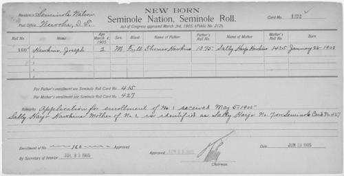| Keywords: Enrollment for Seminole Census Card 132 - NARA - 267706.tif Scope and content Name Rosanna Type Parent Sex Female City of Residence wc Name Foklotka Wilson Type By Blood Age 28 Sex Female Degree Indian Blood Full Roll Number 458 City of Residence th Name John Wilson Type By Blood Age 35 Sex Male Degree Indian Blood Full Roll Number 457 City of Residence wc Name Lucinda Wilson Type By Blood Age 5 Sex Female Degree Indian Blood Full Roll Number 462 City of Residence th Name Melissa Wilson Type By Blood Age 15 Sex Female Degree Indian Blood Full Roll Number 459 City of Residence th Name Mollie Wilson Type By Blood Age 7 Sex Female Degree Indian Blood Full Roll Number 460 City of Residence th Name Munnah Wilson Type By Blood Age 1 Sex Female Degree Indian Blood Full Roll Number 463 City of Residence th Name Sallie Wilson Type By Blood Age 1 Sex Female Degree Indian Blood Full City of Residence th Name Yarner Wilson Type By Blood Age 6 Sex Female Degree Indian Blood Full Roll Number 461 City of Residence th Name Joseph Hawkins Type Newborn Age 2 Sex Male Degree Indian Blood FULL Roll Number 160 Post Office Wewoka General notes 267706 Local identifier 75-53A-SEMINOLE 132 Department of the Interior Office of Indian Affairs Office of the Commissioner to the Five Civilized Tribes 1893 - 1914 NARA's Southwest Region Fort Worth NRFA 1400 John Burgess Drive Fort Worth TX 76140 Record group Record Group 75 Records of the Bureau of Indian Affairs 1793 - 1999 Record group ARC 404 Enrollment Cards compiled 1898 - 1914 Series ARC 251747 File unit File unit ARC Variant control numbers NAIL Control Number NRFF-75-53A-45422<br /> NAIL Control Number NRFF-75-53A-51578<br /> NAIL Control Number NRFF-75-53A-51601<br /> NAIL Control Number NRFF-75-53A-51616<br /> NAIL Control Number NRFF-75-53A-51624<br /> NAIL Control Number NRFF-75-53A-51628<br /> NAIL Control Number NRFF-75-53A-51631<br /> NAIL Control Number NRFF-75-53A-51644<br /> NAIL Control Number NRFF-75-53A-51662<br /> NAIL Control Number NRFF-75-53A-52712<br /> NAIL Control Number NRFF-75-53A-SEMINOLE 132 yes Other versions <gallery> File Enrollment_for_Seminole_Census_Card_132_-_NARA_-_267706 tif tif File Enrollment_for_Seminole_Census_Card_132_-_NARA_-_267706 jpg jpg </gallery> NARA-cooperation PD-USGov Cherokee census cards NARA TIF images with categorized JPGs |