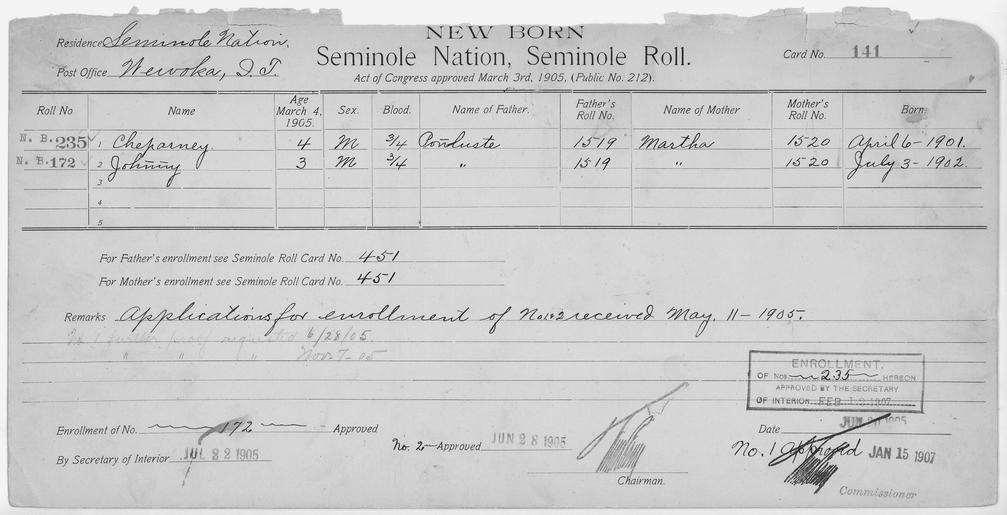 | Keywords: Enrollment for Seminole Census Card 141 - NARA - 267715.tif Scope and content Name Ina Chupco Type By Blood Age 5 Sex Female Degree Indian Blood Full Roll Number 493 City of Residence tp Name Lucy Chupco Type By Blood Age 7 Sex Female Degree Indian Blood Full Roll Number 492 City of Residence tp Name Minnie Chupco Type By Blood Age 24 Sex Female Degree Indian Blood Full Roll Number 491 City of Residence tp Name Mollea Chupco Type By Blood Age 1 Sex Female Degree Indian Blood Full City of Residence tp Name Moses Chupco Type By Blood Age 25 Sex Male Degree Indian Blood Full Roll Number 490 City of Residence yh Name Nokus Harjo Type Parent Sex Male City of Residence th Name Hepsey Type Parent Sex Female City of Residence yh Name Miccuche Type Parent Sex Male City of Residence th Name Sarah Type Parent Sex Female City of Residence tp Name Cheparney Type Newborn Age 4 Sex Male Degree Indian Blood 3/4 Roll Number 235 Post Office Wewoka Name Johnny Type Newborn Age 3 Sex Male Degree Indian Blood 3/4 Roll Number 172 Post Office Wewoka General notes 267715 Local identifier 75-53A-SEMINOLE 141 Department of the Interior Office of Indian Affairs Office of the Commissioner to the Five Civilized Tribes 1893 - 1914 NARA's Southwest Region Fort Worth NRFA 1400 John Burgess Drive Fort Worth TX 76140 Record group Record Group 75 Records of the Bureau of Indian Affairs 1793 - 1999 Record group ARC 404 Enrollment Cards compiled 1898 - 1914 Series ARC 251747 File unit File unit ARC Variant control numbers NAIL Control Number NRFF-75-53A-28082<br /> NAIL Control Number NRFF-75-53A-28110<br /> NAIL Control Number NRFF-75-53A-28127<br /> NAIL Control Number NRFF-75-53A-28130<br /> NAIL Control Number NRFF-75-53A-28134<br /> NAIL Control Number NRFF-75-53A-34868<br /> NAIL Control Number NRFF-75-53A-36114<br /> NAIL Control Number NRFF-75-53A-41963<br /> NAIL Control Number NRFF-75-53A-45902<br /> NAIL Control Number NRFF-75-53A-52725<br /> NAIL Control Number NRFF-75-53A-52726<br /> NAIL Control Number NRFF-75-53A-SEMINOLE 141 yes Other versions <gallery> File Enrollment_for_Seminole_Census_Card_141_-_NARA_-_267715 tif tif File Enrollment_for_Seminole_Census_Card_141_-_NARA_-_267715 jpg jpg </gallery> NARA-cooperation PD-USGov Cherokee census cards NARA TIF images with categorized JPGs |
