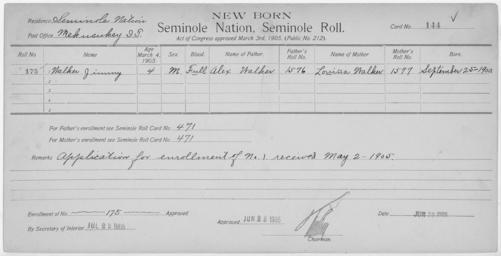 | Keywords: Enrollment for Seminole Census Card 144 - NARA - 267718.tif  Scope and content Name Edmond Factor Type By Blood Age 5 Sex Male Degree Indian Blood 3/4 Roll Number 499 City of Residence tp Name Josey Factor Type By Blood Age 1 Sex Male Degree Indian Blood 3/4 Roll Number 500 City of Residence tp Name June Factor Type By Blood Age 25 Sex Male Degree Indian Blood Full Roll Number 497 City of Residence ee Name Lizzie Factor Type By Blood Age 27 Sex Female Degree Indian Blood 1/2 Roll Number 498 City of Residence tp Name Madelia Type Parent Sex Female City of Residence tp Name Jack Palmer Type Parent Sex Male City of Residence Creek Name Parsaka Type Parent Sex Male City of Residence o Name Sally Type Parent Sex Female City of Residence ee Name Jimmy Walker Type Newborn Age 4 Sex Male Degree Indian Blood FULL Roll Number 175 Post Office Mekusukey General notes 267718 Local identifier 75-53A-SEMINOLE 144 Department of the Interior Office of Indian Affairs Office of the Commissioner to the Five Civilized Tribes 1893 - 1914 NARA's Southwest Region Fort Worth NRFA 1400 John Burgess Drive Fort Worth TX 76140 Record group Record Group 75 Records of the Bureau of Indian Affairs 1793 - 1999 Record group ARC 404 Enrollment Cards compiled 1898 - 1914 Series ARC 251747 File unit File unit ARC Variant control numbers NAIL Control Number NRFF-75-53A-31176<br /> NAIL Control Number NRFF-75-53A-31224<br /> NAIL Control Number NRFF-75-53A-31225<br /> NAIL Control Number NRFF-75-53A-31233<br /> NAIL Control Number NRFF-75-53A-40284<br /> NAIL Control Number NRFF-75-53A-43508<br /> NAIL Control Number NRFF-75-53A-43624<br /> NAIL Control Number NRFF-75-53A-45629<br /> NAIL Control Number NRFF-75-53A-52730<br /> NAIL Control Number NRFF-75-53A-SEMINOLE 144 yes Other versions <gallery> File Enrollment_for_Seminole_Census_Card_144_-_NARA_-_267718 tif tif File Enrollment_for_Seminole_Census_Card_144_-_NARA_-_267718 jpg jpg </gallery> NARA-cooperation PD-USGov Cherokee census cards NARA TIF images with categorized JPGs |