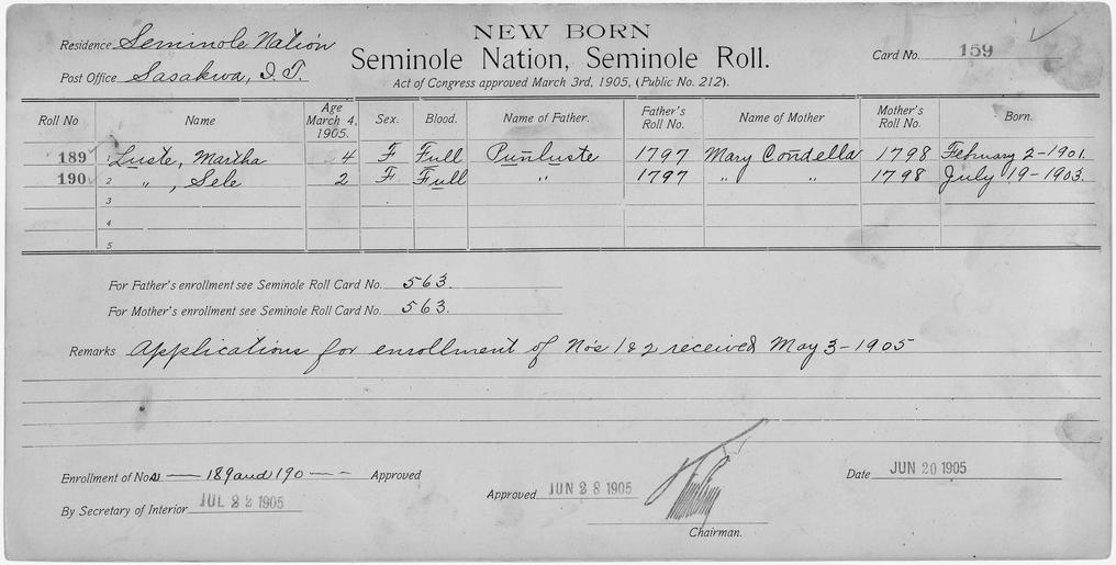 | Keywords: Enrollment for Seminole Census Card 159 - NARA - 267733.tif Scope and content Name Capiche Type Parent Sex Male City of Residence Creek Name Louis Coker Type Parent Sex Male City of Residence Creek Name Eufaula Type Parent Sex Male City of Residence tp Name Jannati Type By Blood Age 10 Sex Female Degree Indian Blood 3/4 Roll Number 556 City of Residence tp Name Rhoda Natukse Type By Blood Age 28 Sex Female Degree Indian Blood 1/2 Roll Number 555 City of Residence tp Name Sukey Natukse Type By Blood Age 45 Sex Female Degree Indian Blood AW Roll Number 554 City of Residence tp Name Notshpyer Type Parent Sex Female City of Residence Creek Name Lucy Reed Type By Blood Age 1 Sex Female Degree Indian Blood 1/2 Roll Number 558 City of Residence tp Name Walter Reed Type Parent Sex Male City of Residence Creek Name Rosana Type By Blood Age 5 Sex Female Degree Indian Blood 1/4 Roll Number 557 City of Residence tp Name Martha Luste Type Newborn Age 4 Sex Female Degree Indian Blood FULL Roll Number 189 Post Office Sasakwa Name Sele Luste Type Newborn Age 2 Sex Female Degree Indian Blood FULL Roll Number 190 Post Office Sasakwa General notes 267733 Local identifier 75-53A-SEMINOLE 159 Department of the Interior Office of Indian Affairs Office of the Commissioner to the Five Civilized Tribes 1893 - 1914 NARA's Southwest Region Fort Worth NRFA 1400 John Burgess Drive Fort Worth TX 76140 Record group Record Group 75 Records of the Bureau of Indian Affairs 1793 - 1999 Record group ARC 404 Enrollment Cards compiled 1898 - 1914 Series ARC 251747 File unit File unit ARC Variant control numbers NAIL Control Number NRFF-75-53A-27100<br /> NAIL Control Number NRFF-75-53A-28477<br /> NAIL Control Number NRFF-75-53A-31099<br /> NAIL Control Number NRFF-75-53A-37471<br /> NAIL Control Number NRFF-75-53A-43002<br /> NAIL Control Number NRFF-75-53A-43003<br /> NAIL Control Number NRFF-75-53A-43319<br /> NAIL Control Number NRFF-75-53A-44903<br /> NAIL Control Number NRFF-75-53A-44919<br /> NAIL Control Number NRFF-75-53A-45420<br /> NAIL Control Number NRFF-75-53A-52756<br /> NAIL Control Number NRFF-75-53A-52757<br /> NAIL Control Number NRFF-75-53A-SEMINOLE 159 yes Other versions <gallery> File Enrollment_for_Seminole_Census_Card_159_-_NARA_-_267733 tif tif File Enrollment_for_Seminole_Census_Card_159_-_NARA_-_267733 jpg jpg </gallery> NARA-cooperation PD-USGov Cherokee census cards NARA TIF images with categorized JPGs |
