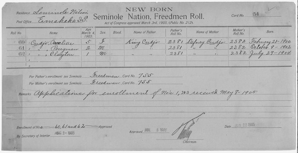 Keywords: Enrollment for Seminole Census Card 54 - NARA - 267628.tif Scope and content Name Dillsa Type By Blood Age 13 Sex Female Degree Indian Blood Full Roll Number 199 City of Residence th Name George Type By Blood Age 18 Sex Male Degree Indian Blood Full Roll Number 197 City of Residence th Name Parsuk Harjoche Type Parent Sex Male City of Residence th Name Liddy Type Parent Sex Female City of Residence th Name Mulcy Type Parent Sex Female City of Residence th Name Mulgusse Type By Blood Age 1 Sex Male Degree Indian Blood Full Roll Number 200 City of Residence th Name Nocosee Type Parent Sex Male City of Residence tp Name Omayaye Type By Blood Age 30 Sex Female Degree Indian Blood Full Roll Number 198 City of Residence th Name Parnoce Type Parent Sex Male City of Residence tp Name Arvaline Cudjo Type Newborn Freedmen-Rejected Age 5 Sex Female Degree Indian Blood Not Reported Roll Number 60 Post Office Emahaka Name Perryman Cudjo Type Newborn Freedmen-Rejected Age 2 Sex Male Degree Indian Blood Not Reported Roll Number 61 Post Office Emahaka Name Clayton Cudjo Type Newborn Freedmen-Rejected Age 1 Sex Male Degree Indian Blood Not Reported Roll Number 62 Post Office Emahaka General notes 267628 Local identifier 75-53A-SEMINOLE 54 Department of the Interior Office of Indian Affairs Office of the Commissioner to the Five Civilized Tribes 1893 - 1914 NARA's Southwest Region Fort Worth NRFA 1400 John Burgess Drive Fort Worth TX 76140 Record group Record Group 75 Records of the Bureau of Indian Affairs 1793 - 1999 Record group ARC 404 Enrollment Cards compiled 1898 - 1914 Series ARC 251747 File unit File unit ARC Variant control numbers NAIL Control Number NRFF-75-53A-30420<br /> NAIL Control Number NRFF-75-53A-32865<br /> NAIL Control Number NRFF-75-53A-35396<br /> NAIL Control Number NRFF-75-53A-39452<br /> NAIL Control Number NRFF-75-53A-42750<br /> NAIL Control Number NRFF-75-53A-42753<br /> NAIL Control Number NRFF-75-53A-43239<br /> NAIL Control Number NRFF-75-53A-43404<br /> NAIL Control Number NRFF-75-53A-43594<br /> NAIL Control Number NRFF-75-53A-52886<br /> NAIL Control Number NRFF-75-53A-52887<br /> NAIL Control Number NRFF-75-53A-52888<br /> NAIL Control Number NRFF-75-53A-SEMINOLE 54 yes Other versions <gallery> File Enrollment_for_Seminole_Census_Card_54_-_NARA_-_267628 tif tif File Enrollment_for_Seminole_Census_Card_54_-_NARA_-_267628 jpg jpg </gallery> NARA-cooperation PD-USGov Cherokee census cards Seminole census cards NARA TIF images with categorized JPGs |