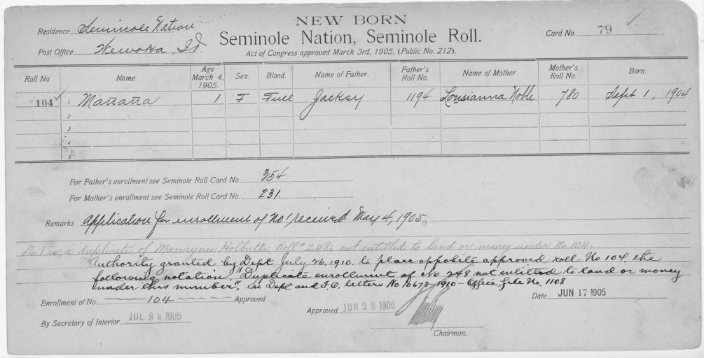 | Keywords: Enrollment for Seminole Census Card 79 - NARA - 267653.jpg Scope and content Name Manana Type Newborn Age 1 Sex Female Degree Indian Blood FULL Roll Number 104 Post Office Wewoka Name Billy Chupcogee Type By Blood Age 25 Sex Male Degree Indian Blood Full Roll Number 279 City of Residence tp Name Ellen Chupcogee Type By Blood Age 3 Sex Female Degree Indian Blood Full Roll Number 281 City of Residence th Name Lisa Chupcogee Type By Blood Age 27 Sex Female Degree Indian Blood Full City of Residence th Name Wilsey Chupcogee Type By Blood Age 7 Sex Male Degree Indian Blood Full Roll Number 280 City of Residence th Name Neha Harjo Type Parent Sex Male City of Residence ee Name Louisa Type Parent Sex Female City of Residence tp Name John Wakey Type Parent Sex Male City of Residence th Name Willagipey Type Parent Sex Female City of Residence th Name Joe Crawford Peoples Type Newborn Freedmen-Rejected Age 2 Sex Male Degree Indian Blood Not Reported Roll Number 86 Post Office Wewoka General notes 267653 Local identifier 75-53A-SEMINOLE 79 Department of the Interior Office of Indian Affairs Office of the Commissioner to the Five Civilized Tribes 1893 - 1914 NARA's Southwest Region Fort Worth NRFA 1400 John Burgess Drive Fort Worth TX 76140 Record group Record Group 75 Records of the Bureau of Indian Affairs 1793 - 1999 Record group ARC 404 Enrollment Cards compiled 1898 - 1914 Series ARC 251747 File unit File unit ARC Variant control numbers NAIL Control Number NRFF-75-53A-28178<br /> NAIL Control Number NRFF-75-53A-28179<br /> NAIL Control Number NRFF-75-53A-28180<br /> NAIL Control Number NRFF-75-53A-28181<br /> NAIL Control Number NRFF-75-53A-34827<br /> NAIL Control Number NRFF-75-53A-39930<br /> NAIL Control Number NRFF-75-53A-50435<br /> NAIL Control Number NRFF-75-53A-51334<br /> NAIL Control Number NRFF-75-53A-52637<br /> NAIL Control Number NRFF-75-53A-52924<br /> NAIL Control Number NRFF-75-53A-SEMINOLE 79 Other versions <gallery> File Enrollment_for_Seminole_Census_Card_79_-_NARA_-_267653 tif tif File Enrollment_for_Seminole_Census_Card_79_-_NARA_-_267653 jpg jpg </gallery> NARA-cooperation PD-USGov Cherokee census cards |