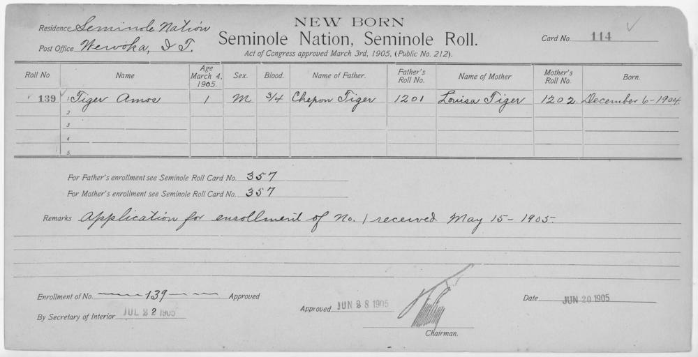 | Keywords: Enrollment for Seminole Census Card 114 - NARA - 267688.jpg Scope and content Name Milly Chupco Type Parent Sex Female City of Residence tp Name Chili Fish Type By Blood Age 27 Sex Male Degree Indian Blood Full Roll Number 391 City of Residence tp Name Ellen Fish Type By Blood Age 25 Sex Female Degree Indian Blood Full Roll Number 392 City of Residence e Name Harriett Fish Type By Blood Age 5 Sex Female Degree Indian Blood Full Roll Number 394 City of Residence e Name Louis Fish Type By Blood Age 7 Sex Male Degree Indian Blood Full Roll Number 393 City of Residence e Name Robert Fish Type By Blood Age 1 Sex Male Degree Indian Blood Full Roll Number 396 City of Residence e Name Fus Harjo Type Parent Sex Male City of Residence k Name Patsey Type Parent Sex Female City of Residence e Name Robert Wolf Type Parent Sex Male City of Residence e Name Amos Tiger Type Newborn Age 1 Sex Male Degree Indian Blood 3/4 Roll Number 139 Post Office Wewoka General notes 267688 Local identifier 75-53A-SEMINOLE 114 Department of the Interior Office of Indian Affairs Office of the Commissioner to the Five Civilized Tribes 1893 - 1914 NARA's Southwest Region Fort Worth NRFA 1400 John Burgess Drive Fort Worth TX 76140 Record group Record Group 75 Records of the Bureau of Indian Affairs 1793 - 1999 Record group ARC 404 Enrollment Cards compiled 1898 - 1914 Series ARC 251747 File unit File unit ARC Variant control numbers NAIL Control Number NRFF-75-53A-28126<br /> NAIL Control Number NRFF-75-53A-31595<br /> NAIL Control Number NRFF-75-53A-31607<br /> NAIL Control Number NRFF-75-53A-31621<br /> NAIL Control Number NRFF-75-53A-31646<br /> NAIL Control Number NRFF-75-53A-31662<br /> NAIL Control Number NRFF-75-53A-34358<br /> NAIL Control Number NRFF-75-53A-43670<br /> NAIL Control Number NRFF-75-53A-51885<br /> NAIL Control Number NRFF-75-53A-52688<br /> NAIL Control Number NRFF-75-53A-SEMINOLE 114 Other versions <gallery> File Enrollment_for_Seminole_Census_Card_114_-_NARA_-_267688 tif tif File Enrollment_for_Seminole_Census_Card_114_-_NARA_-_267688 jpg jpg </gallery> NARA-cooperation PD-USGov Cherokee census cards |
