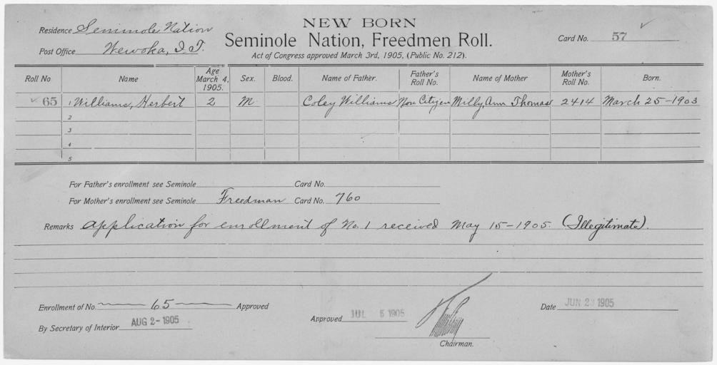 Keywords: Enrollment for Seminole Census Card 57 - NARA - 267631.jpg Scope and content Name Alecky Type Parent Sex Male City of Residence Chickasaw Name Cheponoska Type By Blood Age 1 Sex Male Degree Indian Blood 3/4 Roll Number 212 City of Residence yh Name Hopoille Type By Blood Age 50 Sex Male Degree Indian Blood Full Roll Number 207 City of Residence th Name James Type By Blood Age 12 Sex Male Degree Indian Blood 3/4 Roll Number 210 City of Residence yh Name Lucy Type By Blood Age 38 Sex Female Degree Indian Blood 1/2 Roll Number 208 City of Residence yh Name Simon Peter Type Parent Sex Male City of Residence th Name Selma Type By Blood Age 20 Sex Male Degree Indian Blood 3/4 Roll Number 209 City of Residence yh Name Sissy Type By Blood Age 8 Sex Female Degree Indian Blood 3/4 Roll Number 211 City of Residence yh Name Tethlefka Type Parent Sex Female City of Residence yh Name Herbert Williams Type Newborn Freedmen-Rejected Age 2 Sex Male Degree Indian Blood Not Reported Roll Number 65 Post Office Wewoka General notes 267631 Local identifier 75-53A-SEMINOLE 57 Department of the Interior Office of Indian Affairs Office of the Commissioner to the Five Civilized Tribes 1893 - 1914 NARA's Southwest Region Fort Worth NRFA 1400 John Burgess Drive Fort Worth TX 76140 Record group Record Group 75 Records of the Bureau of Indian Affairs 1793 - 1999 Record group ARC 404 Enrollment Cards compiled 1898 - 1914 Series ARC 251747 File unit File unit ARC Variant control numbers NAIL Control Number NRFF-75-53A-22920<br /> NAIL Control Number NRFF-75-53A-27608<br /> NAIL Control Number NRFF-75-53A-36723<br /> NAIL Control Number NRFF-75-53A-37430<br /> NAIL Control Number NRFF-75-53A-40169<br /> NAIL Control Number NRFF-75-53A-44032<br /> NAIL Control Number NRFF-75-53A-46580<br /> NAIL Control Number NRFF-75-53A-47114<br /> NAIL Control Number NRFF-75-53A-48904<br /> NAIL Control Number NRFF-75-53A-52892<br /> NAIL Control Number NRFF-75-53A-SEMINOLE 57 Other versions <gallery> File Enrollment_for_Seminole_Census_Card_57_-_NARA_-_267631 tif tif File Enrollment_for_Seminole_Census_Card_57_-_NARA_-_267631 jpg jpg </gallery> NARA-cooperation PD-USGov Cherokee census cards Seminole census cards |