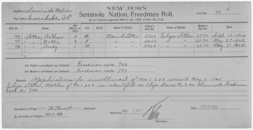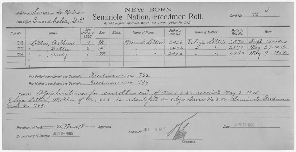 | Keywords: Enrollment for Seminole Census Card 72 - NARA - 267646.jpg Scope and content Name Hobaye Bam Type Parent Sex Male City of Residence Creek Name Liddey Type Parent Sex Female City of Residence e Name Madelia Type Parent Sex Female City of Residence tp Name Jack Palmer Type Parent Sex Male City of Residence Creek Name Jim Palmer Type By Blood Age 17 Sex Male Degree Indian Blood 1/2 Roll Number 266 City of Residence e Name Legus Palmer Type By Blood Age 6 Sex Male Degree Indian Blood 3/4 Roll Number 265 City of Residence e Name Sarney Palmer Type By Blood Age 13 Sex Male Degree Indian Blood 3/4 Roll Number 262 City of Residence e Name Thomas Palmer Type By Blood Age 39 Sex Male Degree Indian Blood 1/2 Roll Number 261 City of Residence tp Name Willey Palmer Type By Blood Age 11 Sex Male Degree Indian Blood 3/4 Roll Number 263 City of Residence e Name Wilsey Palmer Type By Blood Age 9 Sex Male Degree Indian Blood 3/4 Roll Number 264 City of Residence e Name Arthur Lottie Type Newborn Freedmen-Rejected Age 4 Sex Male Degree Indian Blood Not Reported Roll Number 76 Post Office Emahaka Name Bettie Lottie Type Newborn Freedmen-Rejected Age 3 Sex Female Degree Indian Blood Not Reported Roll Number 77 Post Office Emahaka Name Andy Lottie Type Newborn Freedmen-Rejected Age 1 Sex Male Degree Indian Blood Not Reported Roll Number 78 Post Office Emahaka General notes 267646 Local identifier 75-53A-SEMINOLE 72 Department of the Interior Office of Indian Affairs Office of the Commissioner to the Five Civilized Tribes 1893 - 1914 NARA's Southwest Region Fort Worth NRFA 1400 John Burgess Drive Fort Worth TX 76140 Record group Record Group 75 Records of the Bureau of Indian Affairs 1793 - 1999 Record group ARC 404 Enrollment Cards compiled 1898 - 1914 Series ARC 251747 File unit File unit ARC Variant control numbers NAIL Control Number NRFF-75-53A-23687<br /> NAIL Control Number NRFF-75-53A-39445<br /> NAIL Control Number NRFF-75-53A-40281<br /> NAIL Control Number NRFF-75-53A-43507<br /> NAIL Control Number NRFF-75-53A-43514<br /> NAIL Control Number NRFF-75-53A-43517<br /> NAIL Control Number NRFF-75-53A-43528<br /> NAIL Control Number NRFF-75-53A-43534<br /> NAIL Control Number NRFF-75-53A-43538<br /> NAIL Control Number NRFF-75-53A-43539<br /> NAIL Control Number NRFF-75-53A-52911<br /> NAIL Control Number NRFF-75-53A-52912<br /> NAIL Control Number NRFF-75-53A-52913<br /> NAIL Control Number NRFF-75-53A-SEMINOLE 72 Other versions <gallery> File Enrollment_for_Seminole_Census_Card_72_-_NARA_-_267646 tif tif File Enrollment_for_Seminole_Census_Card_72_-_NARA_-_267646 jpg jpg </gallery> NARA-cooperation PD-USGov Cherokee census cards Seminole census cards |