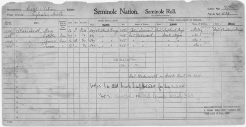 | Keywords: Enrollment for Seminole Census Card 529 - NARA - 268103.tif Scope and content Name Miley Type Parent Sex Female City of Residence nh Name John Spainard Type Parent Sex Male City of Residence nh Name Cad Wadsworth Type Parent Sex Male City of Residence Creek Name Estella Wadsworth Type By Blood Age 23 Sex Female Degree Indian Blood Full Roll Number 1723 City of Residence nh Name James Wadsworth Type By Blood Age 16 Sex Male Degree Indian Blood 1/2 Roll Number 1724 City of Residence nh Name Mary Wadsworth Type By Blood Age 50 Sex Female Degree Indian Blood Full Roll Number 1722 City of Residence nh Name Tasso Wadsworth Type By Blood Age 13 Sex Male Degree Indian Blood 1/2 Roll Number 1725 City of Residence nh General notes 268103 Local identifier 75-53A-SEMINOLE 529 Department of the Interior Office of Indian Affairs Office of the Commissioner to the Five Civilized Tribes 1893 - 1914 NARA's Southwest Region Fort Worth NRFA 1400 John Burgess Drive Fort Worth TX 76140 Record group Record Group 75 Records of the Bureau of Indian Affairs 1793 - 1999 Record group ARC 404 Enrollment Cards compiled 1898 - 1914 Series ARC 251747 File unit File unit ARC Variant control numbers NAIL Control Number NRFF-75-53A-42024<br /> NAIL Control Number NRFF-75-53A-47702<br /> NAIL Control Number NRFF-75-53A-50383<br /> NAIL Control Number NRFF-75-53A-50390<br /> NAIL Control Number NRFF-75-53A-50393<br /> NAIL Control Number NRFF-75-53A-50408<br /> NAIL Control Number NRFF-75-53A-50419<br /> NAIL Control Number NRFF-75-53A-SEMINOLE 529 yes Other versions <gallery> File Enrollment_for_Seminole_Census_Card_529_-_NARA_-_268103 tif tif File Enrollment_for_Seminole_Census_Card_529_-_NARA_-_268103 jpg jpg </gallery> NARA-cooperation PD-USGov Seminole census cards NARA TIF images with categorized JPGs |