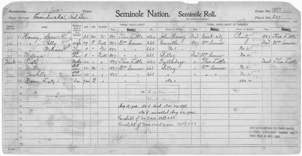 | Keywords: Enrollment for Seminole Census Card 207 - NARA - 267781.jpg Scope and content Name Fullodage Type Parent Sex Male City of Residence tl Name John Haney Type Parent Sex Male City of Residence Creek Name Luty Haney Type By Blood Age 1 Sex Female Degree Indian Blood Full Roll Number 721 City of Residence wc Name Melissa Haney Type By Blood Age 3 Sex Female Degree Indian Blood Full Roll Number 717 City of Residence wc Name Polly Haney Type By Blood Age 29 Sex Female Degree Indian Blood Full Roll Number 716 City of Residence wc Name Sam Haney Type By Blood Age 33 Sex Male Degree Indian Blood 1/2 Roll Number 715 City of Residence tl Name Milly Type By Blood Age 12 Sex Male Degree Indian Blood Full Roll Number 719 City of Residence wc Name Moleya Type By Blood Age 8 Sex Female Degree Indian Blood Full Roll Number 718 City of Residence wc Name Pinty Type Parent Sex Female City of Residence tl Name Pinty Type By Blood Age 60 Sex Female Degree Indian Blood Full City of Residence tl Name Yowelle Type By Blood Age 10 Sex Male Degree Indian Blood Full Roll Number 720 City of Residence wc General notes 267781 Local identifier 75-53A-SEMINOLE 207 Department of the Interior Office of Indian Affairs Office of the Commissioner to the Five Civilized Tribes 1893 - 1914 NARA's Southwest Region Fort Worth NRFA 1400 John Burgess Drive Fort Worth TX 76140 Record group Record Group 75 Records of the Bureau of Indian Affairs 1793 - 1999 Record group ARC 404 Enrollment Cards compiled 1898 - 1914 Series ARC 251747 File unit File unit ARC Variant control numbers NAIL Control Number NRFF-75-53A-32707<br /> NAIL Control Number NRFF-75-53A-33933<br /> NAIL Control Number NRFF-75-53A-33937<br /> NAIL Control Number NRFF-75-53A-33939<br /> NAIL Control Number NRFF-75-53A-33943<br /> NAIL Control Number NRFF-75-53A-33946<br /> NAIL Control Number NRFF-75-53A-42186<br /> NAIL Control Number NRFF-75-53A-42368<br /> NAIL Control Number NRFF-75-53A-44191<br /> NAIL Control Number NRFF-75-53A-44192<br /> NAIL Control Number NRFF-75-53A-52619<br /> NAIL Control Number NRFF-75-53A-SEMINOLE 207 Other versions <gallery> File Enrollment_for_Seminole_Census_Card_207_-_NARA_-_267781 tif tif File Enrollment_for_Seminole_Census_Card_207_-_NARA_-_267781 jpg jpg </gallery> NARA-cooperation PD-USGov Seminole census cards |