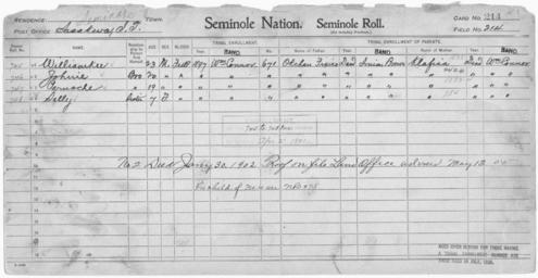 Keywords: Enrollment for Seminole Census Card 214 - NARA - 267788.jpg Scope and content Name Okchan Fixico Type Parent Sex Male City of Residence sb Name Johnie Type By Blood Age 20 Sex Male Degree Indian Blood Full Roll Number 746 City of Residence wc Name Klafisa Type Parent Sex Female City of Residence wc Name Parnoche Type By Blood Age 19 Sex Male Degree Indian Blood Full Roll Number 747 City of Residence wc Name Sally Type By Blood Age 7 Sex Female Degree Indian Blood Full Roll Number 748 City of Residence wc Name Williamkee Type By Blood Age 23 Sex Male Degree Indian Blood Full Roll Number 745 City of Residence wc General notes 267788 Local identifier 75-53A-SEMINOLE 214 Department of the Interior Office of Indian Affairs Office of the Commissioner to the Five Civilized Tribes 1893 - 1914 NARA's Southwest Region Fort Worth NRFA 1400 John Burgess Drive Fort Worth TX 76140 Record group Record Group 75 Records of the Bureau of Indian Affairs 1793 - 1999 Record group ARC 404 Enrollment Cards compiled 1898 - 1914 Series ARC 251747 File unit File unit ARC Variant control numbers NAIL Control Number NRFF-75-53A-32020<br /> NAIL Control Number NRFF-75-53A-37703<br /> NAIL Control Number NRFF-75-53A-38815<br /> NAIL Control Number NRFF-75-53A-43596<br /> NAIL Control Number NRFF-75-53A-45630<br /> NAIL Control Number NRFF-75-53A-51343<br /> NAIL Control Number NRFF-75-53A-SEMINOLE 214 Other versions <gallery> File Enrollment_for_Seminole_Census_Card_214_-_NARA_-_267788 tif tif File Enrollment_for_Seminole_Census_Card_214_-_NARA_-_267788 jpg jpg </gallery> NARA-cooperation PD-USGov Seminole census cards |