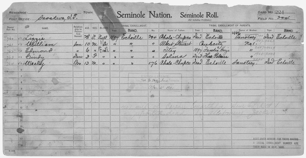Keywords: Enrollment for Seminole Census Card 224 - NARA - 267798.tif Scope and content Name Ahala Chupco Type Parent Sex Male City of Residence e Name Cindy Type By Blood Age 3 Sex Female Degree Indian Blood Full Roll Number 763 City of Residence e Name Edmond Type By Blood Age 6 Sex Male Degree Indian Blood Full Roll Number 762 City of Residence e Name Itey Type Parent Sex Male City of Residence th Name Lizzie Type By Blood Age 28 Sex Female Degree Indian Blood Full Roll Number 760 City of Residence e Name Salma Type Parent Sex Male City of Residence tp Name Sanotsey Type Parent Sex Female City of Residence e Name Albert Stewart Type Parent Sex Male City of Residence Creek Name Weely Type By Blood Age 13 Sex Male Degree Indian Blood Full Roll Number 764 City of Residence e Name William Type By Blood Age 10 Sex Male Degree Indian Blood 1/2 Roll Number 761 City of Residence e General notes 267798 Local identifier 75-53A-SEMINOLE 224 Department of the Interior Office of Indian Affairs Office of the Commissioner to the Five Civilized Tribes 1893 - 1914 NARA's Southwest Region Fort Worth NRFA 1400 John Burgess Drive Fort Worth TX 76140 Record group Record Group 75 Records of the Bureau of Indian Affairs 1793 - 1999 Record group ARC 404 Enrollment Cards compiled 1898 - 1914 Series ARC 251747 File unit File unit ARC Variant control numbers NAIL Control Number NRFF-75-53A-28051<br /> NAIL Control Number NRFF-75-53A-28235<br /> NAIL Control Number NRFF-75-53A-30773<br /> NAIL Control Number NRFF-75-53A-37222<br /> NAIL Control Number NRFF-75-53A-39656<br /> NAIL Control Number NRFF-75-53A-45632<br /> NAIL Control Number NRFF-75-53A-45870<br /> NAIL Control Number NRFF-75-53A-47969<br /> NAIL Control Number NRFF-75-53A-50941<br /> NAIL Control Number NRFF-75-53A-51339<br /> NAIL Control Number NRFF-75-53A-SEMINOLE 224 yes Other versions <gallery> File Enrollment_for_Seminole_Census_Card_224_-_NARA_-_267798 tif tif File Enrollment_for_Seminole_Census_Card_224_-_NARA_-_267798 jpg jpg </gallery> NARA-cooperation PD-USGov Seminole census cards NARA TIF images with categorized JPGs |