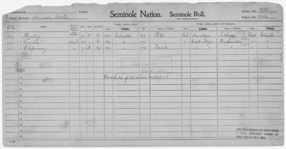 Keywords: Enrollment for Seminole Census Card 226 - NARA - 267800.jpg Scope and content Name Cheparney Type By Blood Age 7 Sex Male Degree Indian Blood 1/2 Roll Number 771 City of Residence e Name Hully Type By Blood Age 70 Sex Female Degree Indian Blood 1/2 Roll Number 769 City of Residence e Name Hupsuchey Type Parent Sex Female City of Residence e Name Louisa Type By Blood Age 10 Sex Female Degree Indian Blood 1/2 Roll Number 770 City of Residence e Name Tothega Type Parent Sex Female City of Residence e General notes 267800 Local identifier 75-53A-SEMINOLE 226 Department of the Interior Office of Indian Affairs Office of the Commissioner to the Five Civilized Tribes 1893 - 1914 NARA's Southwest Region Fort Worth NRFA 1400 John Burgess Drive Fort Worth TX 76140 Record group Record Group 75 Records of the Bureau of Indian Affairs 1793 - 1999 Record group ARC 404 Enrollment Cards compiled 1898 - 1914 Series ARC 251747 File unit File unit ARC Variant control numbers NAIL Control Number NRFF-75-53A-27600<br /> NAIL Control Number NRFF-75-53A-36898<br /> NAIL Control Number NRFF-75-53A-36956<br /> NAIL Control Number NRFF-75-53A-39933<br /> NAIL Control Number NRFF-75-53A-50066<br /> NAIL Control Number NRFF-75-53A-SEMINOLE 226 Other versions <gallery> File Enrollment_for_Seminole_Census_Card_226_-_NARA_-_267800 tif tif File Enrollment_for_Seminole_Census_Card_226_-_NARA_-_267800 jpg jpg </gallery> NARA-cooperation PD-USGov Seminole census cards |