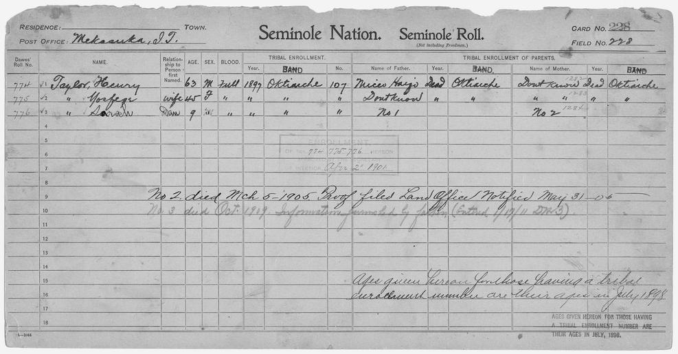 Keywords: Enrollment for Seminole Census Card 228 - NARA - 267802.tif Scope and content Name Micco Harjo Type Parent Sex Male City of Residence o Name Henry Taylor Type By Blood Age 63 Sex Male Degree Indian Blood Full Roll Number 774 City of Residence o Name Sarah Taylor Type By Blood Age 9 Sex Female Degree Indian Blood Full Roll Number 776 City of Residence o Name Yosfege Taylor Type By Blood Age 45 Sex Female Degree Indian Blood Full Roll Number 775 City of Residence o General notes 267802 Local identifier 75-53A-SEMINOLE 228 Department of the Interior Office of Indian Affairs Office of the Commissioner to the Five Civilized Tribes 1893 - 1914 NARA's Southwest Region Fort Worth NRFA 1400 John Burgess Drive Fort Worth TX 76140 Record group Record Group 75 Records of the Bureau of Indian Affairs 1793 - 1999 Record group ARC 404 Enrollment Cards compiled 1898 - 1914 Series ARC 251747 File unit File unit ARC Variant control numbers NAIL Control Number NRFF-75-53A-34740<br /> NAIL Control Number NRFF-75-53A-48691<br /> NAIL Control Number NRFF-75-53A-48755<br /> NAIL Control Number NRFF-75-53A-48781<br /> NAIL Control Number NRFF-75-53A-SEMINOLE 228 yes Other versions <gallery> File Enrollment_for_Seminole_Census_Card_228_-_NARA_-_267802 tif tif File Enrollment_for_Seminole_Census_Card_228_-_NARA_-_267802 jpg jpg </gallery> NARA-cooperation PD-USGov Seminole census cards NARA TIF images with categorized JPGs |