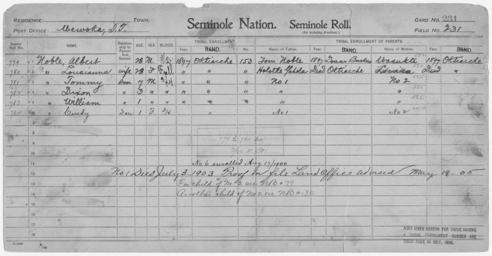 Keywords: Enrollment for Seminole Census Card 231 - NARA - 267805.tif Scope and content Name Albert Noble Type By Blood Age 28 Sex Male Degree Indian Blood 1/2 Roll Number 779 City of Residence o Name Cindy Noble Type By Blood Age 1 Sex Female Degree Indian Blood 3/4 Roll Number 784 City of Residence o Name Dixon Noble Type By Blood Age 3 Sex Male Degree Indian Blood 3/4 Roll Number 782 City of Residence o Name Lousianna Noble Type By Blood Age 28 Sex Female Degree Indian Blood Full Roll Number 780 City of Residence o Name Tom Noble Type Parent Sex Male City of Residence db Name Tommy Noble Type By Blood Age 7 Sex Male Degree Indian Blood 3/4 Roll Number 781 City of Residence o Name William Noble Type By Blood Age 1 Sex Male Degree Indian Blood 3/4 Roll Number 783 City of Residence o Name Wasukte Type Parent Sex Female City of Residence o Name Holotke Yahola Type Parent Sex Male City of Residence o General notes 267805 Local identifier 75-53A-SEMINOLE 231 Department of the Interior Office of Indian Affairs Office of the Commissioner to the Five Civilized Tribes 1893 - 1914 NARA's Southwest Region Fort Worth NRFA 1400 John Burgess Drive Fort Worth TX 76140 Record group Record Group 75 Records of the Bureau of Indian Affairs 1793 - 1999 Record group ARC 404 Enrollment Cards compiled 1898 - 1914 Series ARC 251747 File unit File unit ARC Variant control numbers NAIL Control Number NRFF-75-53A-43196<br /> NAIL Control Number NRFF-75-53A-43201<br /> NAIL Control Number NRFF-75-53A-43203<br /> NAIL Control Number NRFF-75-53A-43210<br /> NAIL Control Number NRFF-75-53A-43224<br /> NAIL Control Number NRFF-75-53A-43230<br /> NAIL Control Number NRFF-75-53A-43234<br /> NAIL Control Number NRFF-75-53A-50756<br /> NAIL Control Number NRFF-75-53A-52136<br /> NAIL Control Number NRFF-75-53A-SEMINOLE 231 yes Other versions <gallery> File Enrollment_for_Seminole_Census_Card_231_-_NARA_-_267805 tif tif File Enrollment_for_Seminole_Census_Card_231_-_NARA_-_267805 jpg jpg </gallery> NARA-cooperation PD-USGov Seminole census cards NARA TIF images with categorized JPGs |