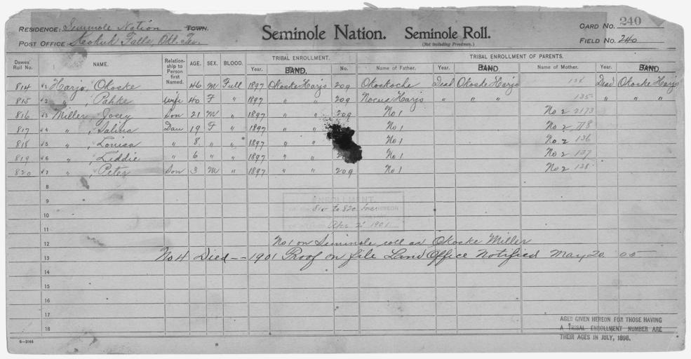 | Keywords: Enrollment for Seminole Census Card 240 - NARA - 267814.jpg  Scope and content Name Nocus Harjo Type Parent Sex Male City of Residence oh Name Okoske Harjo Type By Blood Age 46 Sex Male Degree Indian Blood Full Roll Number 814 City of Residence oh Name Pahke Harjo Type By Blood Age 40 Sex Female Degree Indian Blood Full Roll Number 815 City of Residence oh Name Josey Miller Type By Blood Age 21 Sex Male Degree Indian Blood Full Roll Number 816 City of Residence oh Name Liddie Miller Type By Blood Age 6 Sex Female Degree Indian Blood Full Roll Number 819 City of Residence oh Name Louisa Miller Type By Blood Age 8 Sex Female Degree Indian Blood Full Roll Number 818 City of Residence oh Name Peter Miller Type By Blood Age 3 Sex Male Degree Indian Blood Full Roll Number 820 City of Residence oh Name Salina Miller Type By Blood Age 19 Sex Female Degree Indian Blood Full Roll Number 817 City of Residence oh General notes 267814 Local identifier 75-53A-SEMINOLE 240 Department of the Interior Office of Indian Affairs Office of the Commissioner to the Five Civilized Tribes 1893 - 1914 NARA's Southwest Region Fort Worth NRFA 1400 John Burgess Drive Fort Worth TX 76140 Record group Record Group 75 Records of the Bureau of Indian Affairs 1793 - 1999 Record group ARC 404 Enrollment Cards compiled 1898 - 1914 Series ARC 251747 File unit File unit ARC Variant control numbers NAIL Control Number NRFF-75-53A-34858<br /> NAIL Control Number NRFF-75-53A-34909<br /> NAIL Control Number NRFF-75-53A-34928<br /> NAIL Control Number NRFF-75-53A-42079<br /> NAIL Control Number NRFF-75-53A-42084<br /> NAIL Control Number NRFF-75-53A-42092<br /> NAIL Control Number NRFF-75-53A-42108<br /> NAIL Control Number NRFF-75-53A-42116<br /> NAIL Control Number NRFF-75-53A-SEMINOLE 240 Other versions <gallery> File Enrollment_for_Seminole_Census_Card_240_-_NARA_-_267814 tif tif File Enrollment_for_Seminole_Census_Card_240_-_NARA_-_267814 jpg jpg </gallery> NARA-cooperation PD-USGov Seminole census cards |