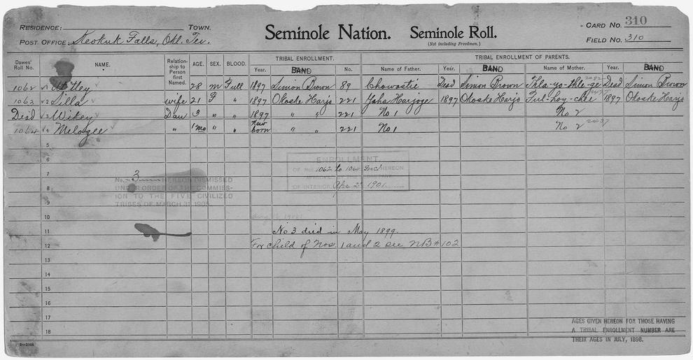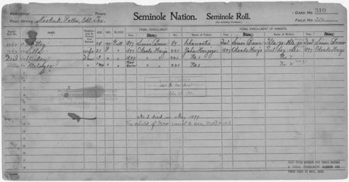 Keywords: Enrollment for Seminole Census Card 310 - NARA - 267884.tif Scope and content Name Chowastie Type Parent Sex Male City of Residence sb Name Fulhoychee Type Parent Sex Female City of Residence oh Name Yaha Harjoge Type Parent Sex Male City of Residence oh Name Melogee Type By Blood Age 1 Sex Female Degree Indian Blood Full Roll Number 1064 City of Residence oh Name Silla Type By Blood Age 21 Sex Female Degree Indian Blood Full Roll Number 1063 City of Residence oh Name Thlayothlege Type Parent Sex Female City of Residence sb Name Uttley Type By Blood Age 28 Sex Male Degree Indian Blood Full Roll Number 1062 City of Residence sb Name Wikey Type By Blood Age 3 Sex Female Degree Indian Blood Full City of Residence oh General notes 267884 Local identifier 75-53A-SEMINOLE 310 Department of the Interior Office of Indian Affairs Office of the Commissioner to the Five Civilized Tribes 1893 - 1914 NARA's Southwest Region Fort Worth NRFA 1400 John Burgess Drive Fort Worth TX 76140 Record group Record Group 75 Records of the Bureau of Indian Affairs 1793 - 1999 Record group ARC 404 Enrollment Cards compiled 1898 - 1914 Series ARC 251747 File unit File unit ARC Variant control numbers NAIL Control Number NRFF-75-53A-28017<br /> NAIL Control Number NRFF-75-53A-32703<br /> NAIL Control Number NRFF-75-53A-35450<br /> NAIL Control Number NRFF-75-53A-41787<br /> NAIL Control Number NRFF-75-53A-46838<br /> NAIL Control Number NRFF-75-53A-48956<br /> NAIL Control Number NRFF-75-53A-50275<br /> NAIL Control Number NRFF-75-53A-51249<br /> NAIL Control Number NRFF-75-53A-SEMINOLE 310 yes Other versions <gallery> File Enrollment_for_Seminole_Census_Card_310_-_NARA_-_267884 tif tif File Enrollment_for_Seminole_Census_Card_310_-_NARA_-_267884 jpg jpg </gallery> NARA-cooperation PD-USGov Seminole census cards NARA TIF images with categorized JPGs |