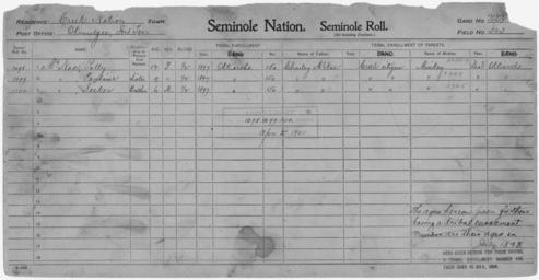 Keywords: Enrollment for Seminole Census Card 323 - NARA - 267897.jpg Scope and content Name Charley McNac Type Parent Sex Male City of Residence Creek Name Pauline McNac Type By Blood Age 9 Sex Female Degree Indian Blood 1/2 Roll Number 1099 City of Residence o Name Polly McNac Type By Blood Age 12 Sex Female Degree Indian Blood 1/2 Roll Number 1098 City of Residence o Name Seeker McNac Type By Blood Age 6 Sex Male Degree Indian Blood 1/2 Roll Number 1100 City of Residence o Name Minkey Type Parent Sex Female City of Residence o General notes 267897 Local identifier 75-53A-SEMINOLE 323 Department of the Interior Office of Indian Affairs Office of the Commissioner to the Five Civilized Tribes 1893 - 1914 NARA's Southwest Region Fort Worth NRFA 1400 John Burgess Drive Fort Worth TX 76140 Record group Record Group 75 Records of the Bureau of Indian Affairs 1793 - 1999 Record group ARC 404 Enrollment Cards compiled 1898 - 1914 Series ARC 251747 File unit File unit ARC Variant control numbers NAIL Control Number NRFF-75-53A-41582<br /> NAIL Control Number NRFF-75-53A-41619<br /> NAIL Control Number NRFF-75-53A-41624<br /> NAIL Control Number NRFF-75-53A-41629<br /> NAIL Control Number NRFF-75-53A-42230<br /> NAIL Control Number NRFF-75-53A-SEMINOLE 323 Other versions <gallery> File Enrollment_for_Seminole_Census_Card_323_-_NARA_-_267897 tif tif File Enrollment_for_Seminole_Census_Card_323_-_NARA_-_267897 jpg jpg </gallery> NARA-cooperation PD-USGov Seminole census cards |