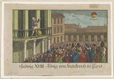 | Keywords: Entrée de sa majesté Louis XVIII à Paris le 3 Mai 1814 - Library of Congress.tif Print shows King Louis XVIII standing on a balcony and a crowd below watching a hot air balloon in the distance 1814 1 print woodcut hand-colored 11 x 16 5 cm sheet Institution LOC object history exhibition history credit line LOC-image ds 04683 accession number PD-100 Images of Paris from the Library of Congress Louis XVIII of France 1814 in Paris Balconies in Paris Crowds in Paris Hot air balloons in Paris 1814 Prints of Paris Colored woodcuts |