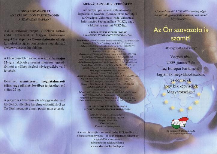 | Keywords: EP election 2009 in Hungary, Voter invitation card, face 1.jpg European Parliament election of 2009 Frontpage This card has been delievered alongside with a proposal coupon in Hungarian kopogtatócédula or ajánlószelvény and a voter registration card for registered voters via letter Color 300 dpi Hardware Epson Perfection v10 Translation Page 1 How can you vote if you are overseas by the time of the election Those who are overseas while the election is in progress can vote through the Republic of Hungary's consulates and embassies of which addresses can be found on www valasztas hu Only those are able to vote through a foreign representation who request their enrolment on the foreign representation voters ™ list from the local notary public in the district of his/her residence until 22 May 2009 Such a request can be done personally or by a designated representative or via registered mail The notary public will respond via mail on your request's approval or rejection Page 2 Let us answer your questions If you need further information about the European Parliament election do not hesitate to visit the Information Service of the National Election Office or your local Information Service in your district Addresses of local Information Services Information on the participation will be available on www valasztas hu on the date of election Results will be hold back until the voting process ends in all of the countries Page 3 Five years ago 3 097 657 voters decided about Hungary's EP delegation Your vote counts too Now here is your chance Participate in the upcoming EP election on 7th June 2009 and decide about who will represent Hungary - prospectus by the National Election Office hu Az Országos Választási Iroda szóróanyaga a 2009 évi európai parlamenti választásokhoz CÃmlap A választási névjegyzékre felvettek kapták kézhez az ajánlószelvénnyel és a névjegyzéki értesÃtÅ‘vel együtt SzÃnes 300 dpi Szkenner Epson Perfection v10 Az eredeti szöveg 1 oldal žHogyan szavazhat aki külföldön tartózkodik a szavazás napján Aki a szavazás napján külföldön tartózkodik szavazatát a Magyar Köztársaság nagykövetségein és fÅ‘konzulátusain adhatja le melyek listája és pontos cÃme megtalálható a www valasztas hu oldalon A külképviseleten akkor szavazhat ha május 22-ig a lakóhelye szerint illetékes jegyzÅ‘tÅ‘l kéri a külképviseleti névjegyzékbe való felvételt Kérelmét személyesen meghatalmazott útján vagy ajánlott levélben terjesztheti elÅ‘ május 22-ig A jegyzÅ‘ a külképviseleti névjegyzékbe való felvételrÅ‘l illetÅ‘leg kérelme elutasÃtásáról az Ön által megadott cÃmen postai úton értesÃti 2 oldal žMegválaszoljuk kérdéseit Az európai parlamenti választásokkal kapcsolatos további információkért forduljon az Országos Választási Iroda Választási Információs Szolgálatához VISZ vagy a lakóhelye szerinti VISZ-hez A területi választási irodák választási információs szolgálatai A szavazás napján a résztvételi adatokról továbbá az elÅ‘zetes eredméyekrÅ‘l - miután minden tagállamban befejezÅ‘dött a szavazás - folyamatosan tájékozódhat a www valasztas hu honlapon 3 oldal žÃ–t évvel ezelÅ‘tt 3 097 657 választópolgár döntött Magyarország európai parlamenti képviseletérÅ‘l Az Ön szavazata is számÃt Most újra itt a lehetÅ‘ség Vegyen részt 2009 június 7-én az európai Parlament tagjainak megválasztásában és döntse el hogy kik képviseljék Magyarországot - Az Országos Választási Iroda közszolgálati tájékoztatója en Scanned by the uploader hu Saját szkennelés Hungary hu A szerzÅ‘ ismeretlen Közreadó http //www valasztas hu/ Az Országos Választási Iroda Publication 2009 PD-HU-exempt thumb 100px Frontpage only / CÃmlap Voter invitation cards European Parliament election 2009 Hungary |
