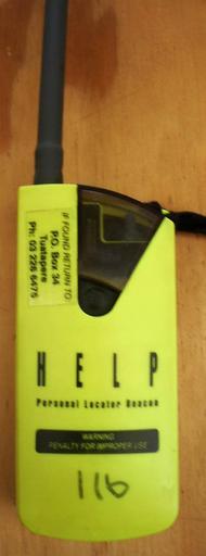 | Keywords: EPIRB NZ.jpg en Emergency Position Indicating Radio Beacon EPIRB <br> Emergency Personal Locator Beacon E-PLB own cropped Sarang 2005 01 09 small PLB carried on a hiking track in New Zealand partial Emergency position indicating radio beacons Cospas-Sarsat |