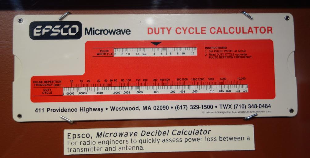 Keywords: Epsco, Microwave Decibel Calculator - MIT Slide Rule Collection - DSC03636.JPG en MIT Slide Rule Collection MIT Museum Cambridge Massachusetts USA The museum permitted photography without restriction 2013-08-04 13 36 38 own Daderot cc-zero MIT Slide Rule Collection Uploaded with UploadWizard |