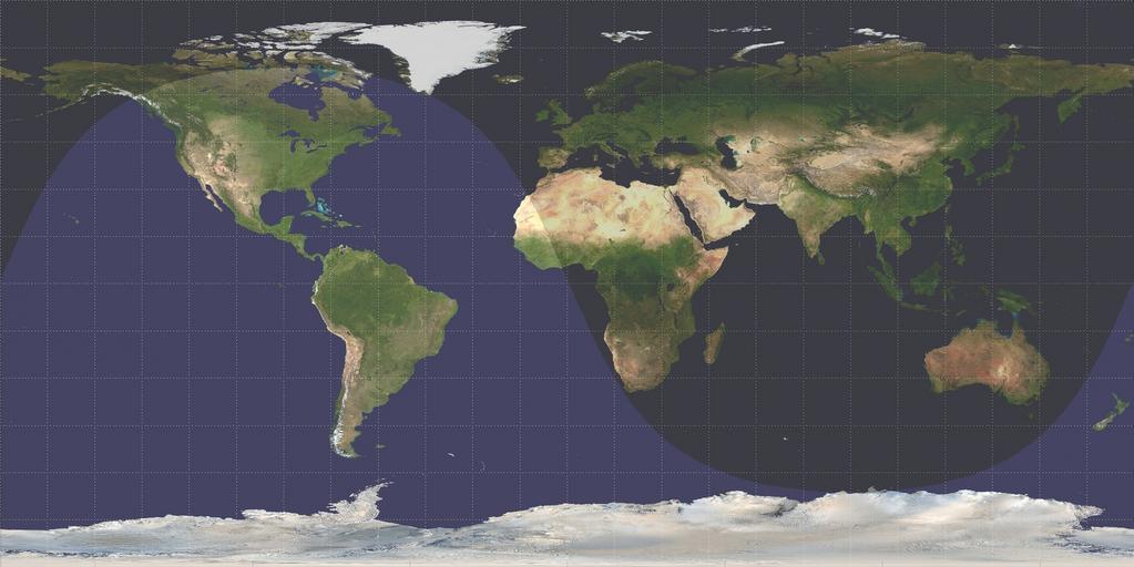 | Keywords: Equirectangular-projection+terminator.jpg en Earth Equirectangular-projection + terminator around 6 pm UTC near the december solstice fr Terminateur sur une projection cylindrique équidistante de la Terre aux environs de 18h UTC vers le solstice de décembre own derivated from File Equirectangular-projection jpg Xofc derivated from a work by user Mdf who used a NASA image 2011-12-21 The terminator has been ploted with gnuplot <pre> set angles degrees set yrange -90 90 set xrange -180 180 set terminal png enhanced size 2048 1024 set output 'core png' f x atan tan 90-23 4 cos x+90 plot f x </pre> resized and used as selection calc for luminosity+contrast enhancement with GIMP See fr WP Oracle/semaine en cours Géométrie Cc-zero Terminator Daylight time maps Time 18 00 to 18 59 Weather and climate characteristics of December Solstices 21st-century maps of the world Blue Marble Next Generation images Maps with Equirectangular projection Global maps centered Greenwich Language-neutral maps Images with Gnuplot source code |