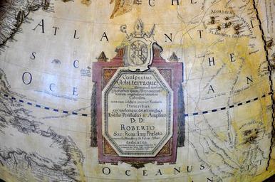Keywords: Erdglobus aus Salem img07.jpg Erdglobus aus der Zisterzienser-Reichsabtei Salem ausgestellt im Neuen Kloster Schussenried; Detail Widmung an Abt Robert Schlecht own own photograph Photo 2011 ~ 1792 Photo User FA2010 Globes from Kloster Salem Robert Schlecht Coats of arms of Salem Abbey Cartouche cartography |