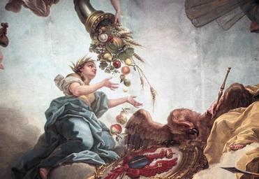 | Keywords: Erhebung des Großen Kurfürsten in den Olymp (van Loo) - weibliche Allegorie mit Ährenkranz und dem brandenburgischen Adler.jpg The Elevation of the Great Elector into Olympus Oil on canvas destroyed in World War II Ceiling painting detail female allegory with wreath of grain ears and the Brandenburg eagle City Palace Potsdam Seen together with the allegory with the cornucopia and the putto strewing coins the allegory with the wreath of grain ears is part of a trio of Abundantia The Prussian eagle and Brandenburg coat of arms belong to the allegory of good governance Die Erhebung des Großen Kurfürsten in den Olymp Öl auf Leinwand Kriegsverlust Deckengemälde Ausschnitt weibliche Allegorie mit Ährenkranz und dem brandenburgischen Adler Stadtschloss Potsdam Die Allegorie mit dem Ährenkranz bildet zusammen mit der Allegorie mit Füllhorn und dem geldstreuenden Putto ein Trio der Abundantia Adler und Wappenschild gehören eher zur Allegorie der Guten Regierung 1751 20366819 LAC 9 003/36 fmlac9003_38 <br /> Foto Peter Cürlis; color ; Aufnahme-Datum um 1944 04/1944 08; Zugang Dauerleihgabe Kunsthistorisches Institut der Universität Mainz Fotoinhalt Ausschnitt weibliche Allegorie mit Ährenkranz und dem brandenburgischen Adler artwork Creator Charles-Amédée-Philippe van Loo file James Steakley Die Erhebung des Großen Kurfürsten in den Olymp van Loo PD-old-100-1923 The Elevation of the Great Elector into Olympus van Loo Paintings of cornucopia Allegories of abundance Coats of arms of Brandenburg Symbols of Prussia |