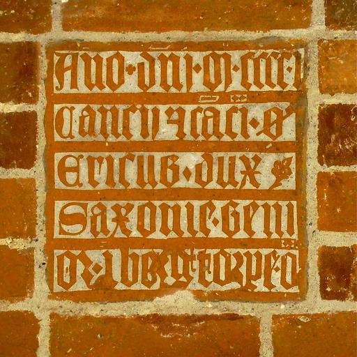 Keywords: EricusDuxRatzeburg.JPG en Plaquette in the dome of Ratzeburg to remember Eric III Duke of Saxe-Lauenburg who was burried at this site in 1401 de Relieftafel in der Wand des Ratzeburger Doms zur Erinnerung an Herzog Erich III von Sachsen-Lauenburg der 1401 hier in der Bergedorfer Kapelle beigesetzt worden war Die Tafel besteht aus rotem Backstein der zwischen den roten Backsteinen des Domes eingemauert ist <br /> Die Bergedorfer Kapelle und mit ihr das Grab Erich III wurde bei Umbauarbeiten im Dom zwischen 1876 und 1881 abgerissen own Carol Christiansen 2010-01-24 Interior of Ratzeburger Dom 1401 works in Germany Latin inscriptions in Schleswig-Holstein Gothic minuscule Saxe-Lauenburg |