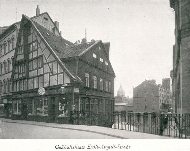 Keywords: Ernst-August-Straße 8, Leineinsel Klein-Venedig, Brücke Leine Regierungsgebäude Brückmühle Neues Rathaus Hannover.jpg Blick auf das mutmaßlich Ende des 16 Jahrhunderts auf der Leineinsel Klein-Venedig in Hannover als Fachwerkhaus errichtete und ehemals denkmalgeschützte Geschäftshaus Ernst-August-Straße 8 gefolgt vom Gebäude mit der Hausnummer 9 in dem zum Zeitpunkt der um 1920 getätigten Aufnahme die Uhren- und Goldwarenhandlung des Hofuhrmachers August Speckmann seinen Sitz hatte Die seltene Fotografie hier als punktgerasterter Druck gewährt einen Blick von der Brücke an der Ecke Calenberger Straße entlang dem Königlichen Regierungsgebäude Dicasteriengebäude über die Leine und zur Brückmühle Ganz im Hintergrund ist bereits die Kuppel des 1913 eingeweihten Neuen Rathauses zu erkennen Nach den Zerstörungen durch die Luftangriffe auf Hannover im Zweiten Weltkrieg wurde der Brückmühlenarm der Leine zugeschüttet und nach Plänen von Stadtbaudirektor Rudolf Hillebrecht für die Autogerechte Stadt hier das mehrspurige Leibnizufer über den Standort hinweggeführt Paul Siedentopf Hauptschriftleiter Das Buch der alten Firmen der Stadt Hannover im Jahr 1927 Jubiläums-Verlag Walter Gerlach Leipzig 1927 S 313 ~ 1920 Zusammenstellung des Bildmaterials Karl Friedrich Leonhardt PD-old Ernst-August-Straße 8 Hannover Brückmühlenarm der Leine Hannover Brückmühle Hannover Regierungsgebäude Hannover Bridges in Hannover Ernst-August-Straße 9 Hannover |