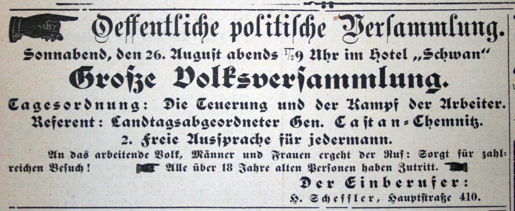 Keywords: Ernst Castan in Schönheide Anzeige Schönheider Wochenblatt August 1910.jpg Schönheide im Erzgebirge Das Mitglied des sächsischen Landtages Ernst Castan Inhaber des Wahlbezirks Chemnitz 4 sprach am 26 August 1910 bei einer Veranstaltung im Hotel Schwan Die Ankündigung nennt nicht eine Partei als Veranstalter Ernst Castan war Mitglied der SPD Obwohl die Veranstaltung an einem Sonnabend war wurde erst auf 20 30 Uhr eingeladen Damals war es selbstverständlich dass sonnabends in den Fabriken und anderswo gearbeitet wurde Danach waren häusliche Arbeiten wie das Ausmisten des Kaninchenstalls und das Reinigungsbad zu erledigen So konnte auf 20 30 Uhr eingeladen werden “ Eine Anzeige im Schönheider Wochenblatt Zeitungsanzeige vom August 1910 Schönheider Wochenblatt 1910 Ernst Castan Schönheider Wochenblatt Cc-zero |