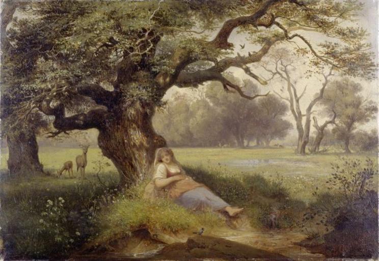 | Keywords: Ernst Ferdinand Oehme - Landschaft mit schlafendem Mädchen.jpg Artwork Creator Ernst Ferdinand Oehme 1853 oil on canvas cm 26 38 Institution Museum der bildenden Künste Leipzig http //www sternburg-stiftung de/gemaelde/popup_112 html Maximilian Speck von Sternburg Stiftung im Museum der bildenden Künste Leipzig object history credit line E Oehme 1853 ~ lower right signature and date accession number 1723 http //artnews org/mbdk/ exi 34814 artnews org PD-old-100-1923 DEFAULTSORT Oehme Ernst Ferdinand; Landschaft mit schlafendem Mädche 1853; Museum der bildenden Künste Ernst Ferdinand Oehme Paintings in the Museum der bildenden Künste Landscape paintings of Germany 1830s landscape paintings Oaks in art 1838 paintings Collection Maximilian Speck von Sternburg |