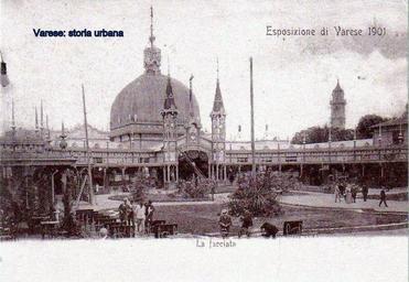 Keywords: Dietro la cupola è visibile palazzo Estense, a destra emerge il campanile di San Vittore. varese giardinipubblici esposizione1901